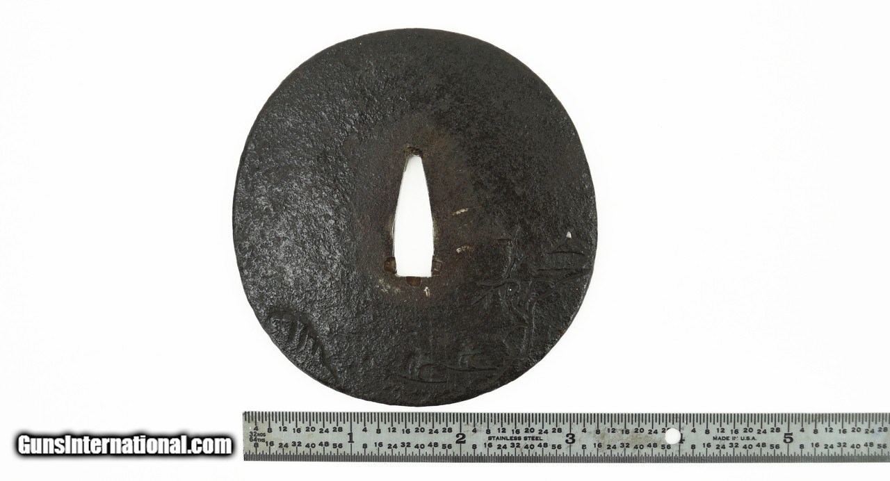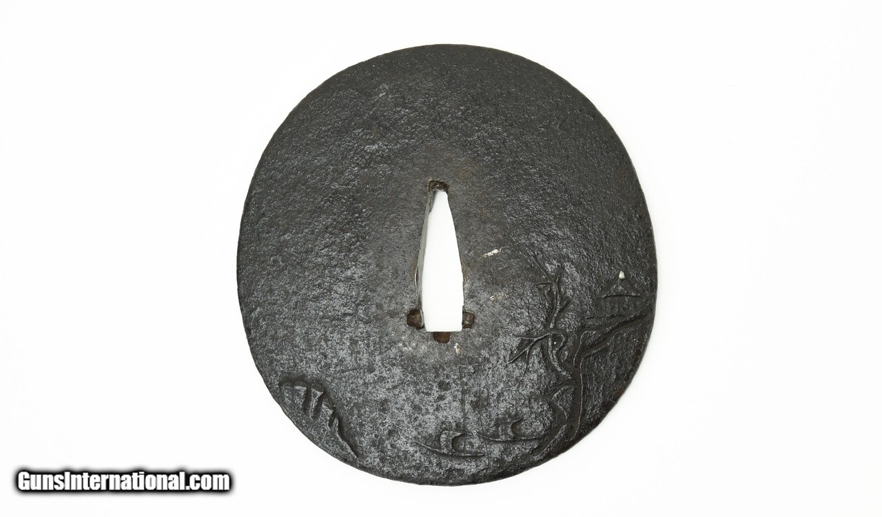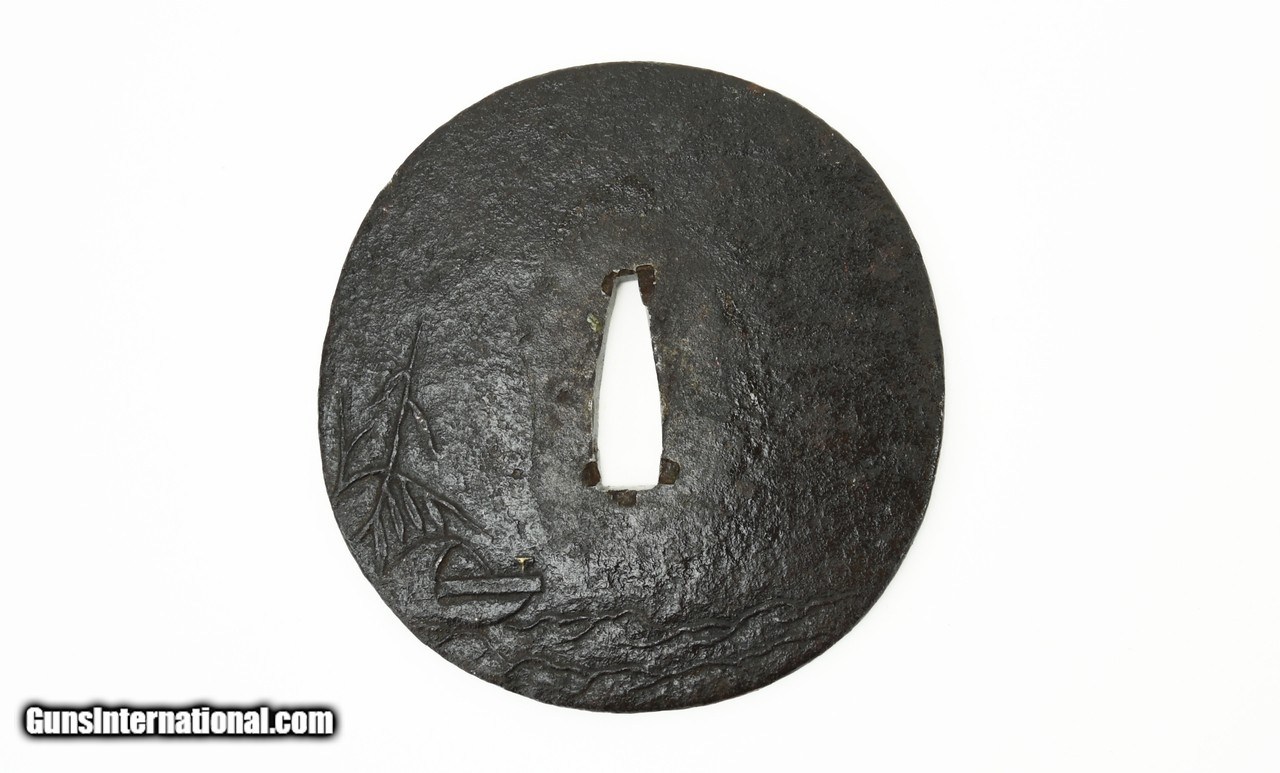 Description: "Iron Tsuba. Village scene with trees, sailing boats on water and trees. No Hitsu Ana, which is rare. Probably mid-Muromachi. 3 7/16" (4.6cm) diameter. Katana size. SOLD |