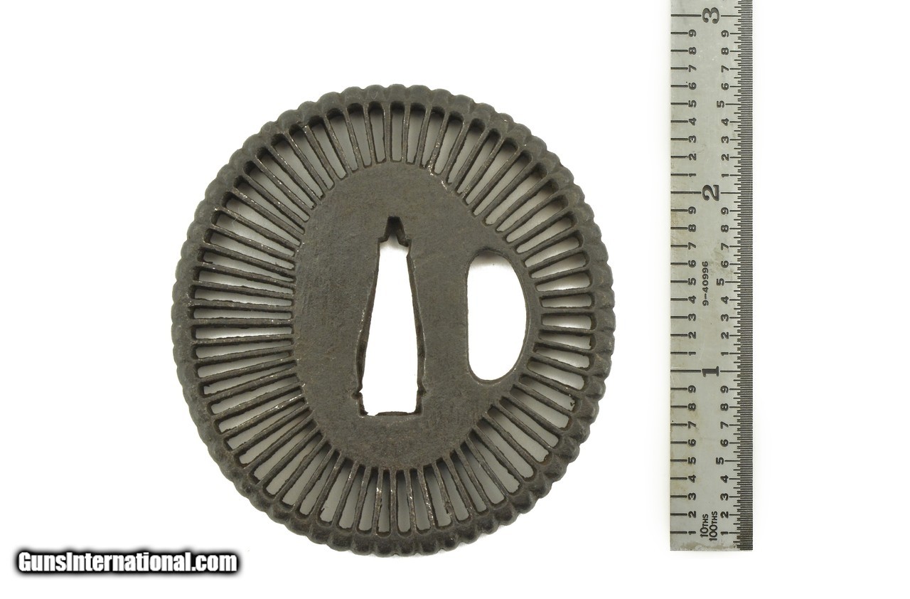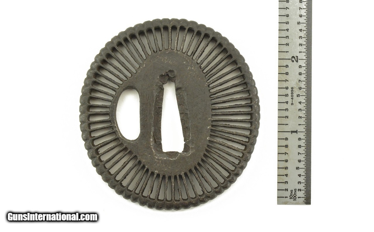 Description: "Iron Tsuba. Sukashi with petal design. Unsigned. Tanto or wakizashi size. Vertical dimension 2 5/8". SOLD |