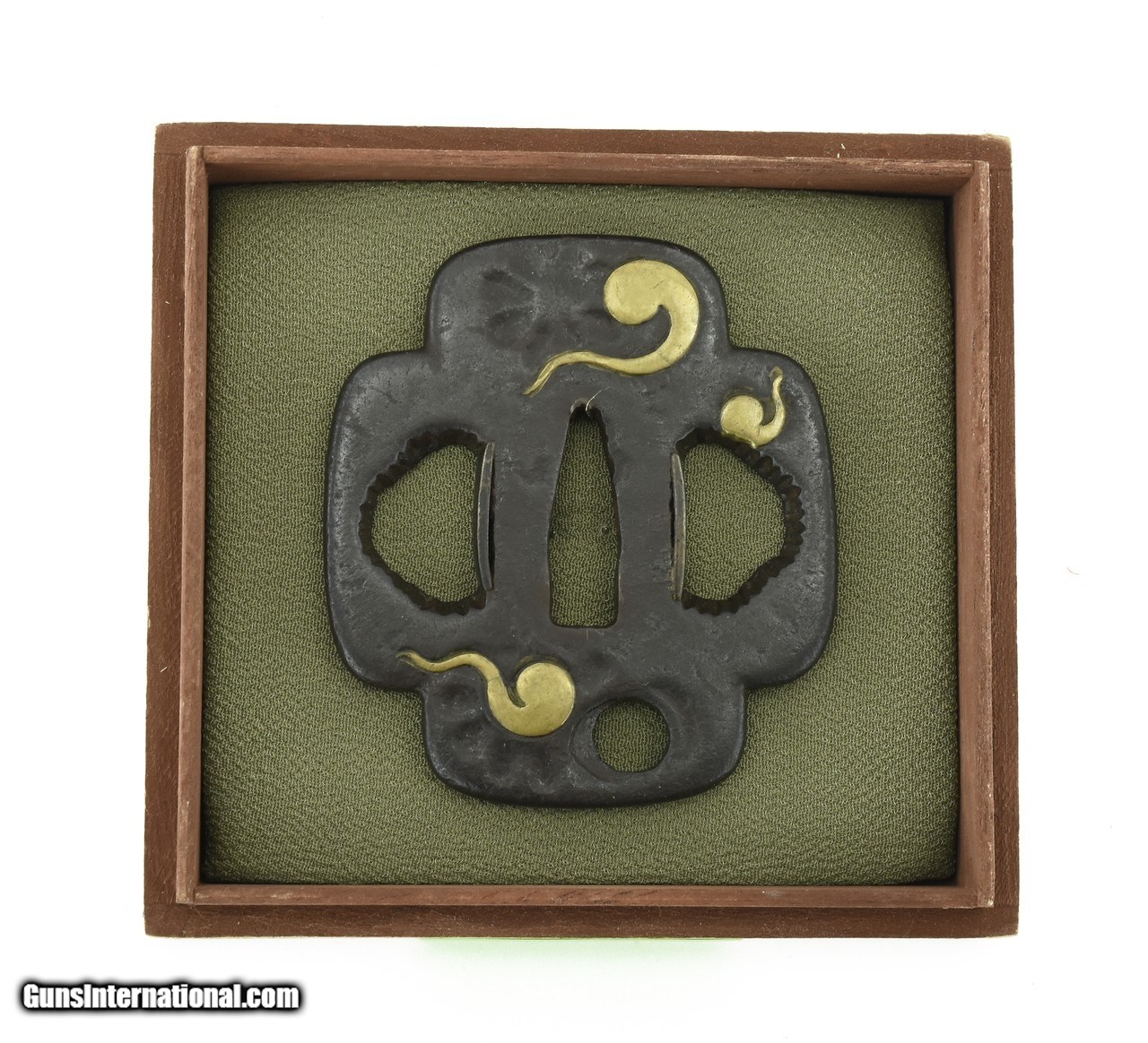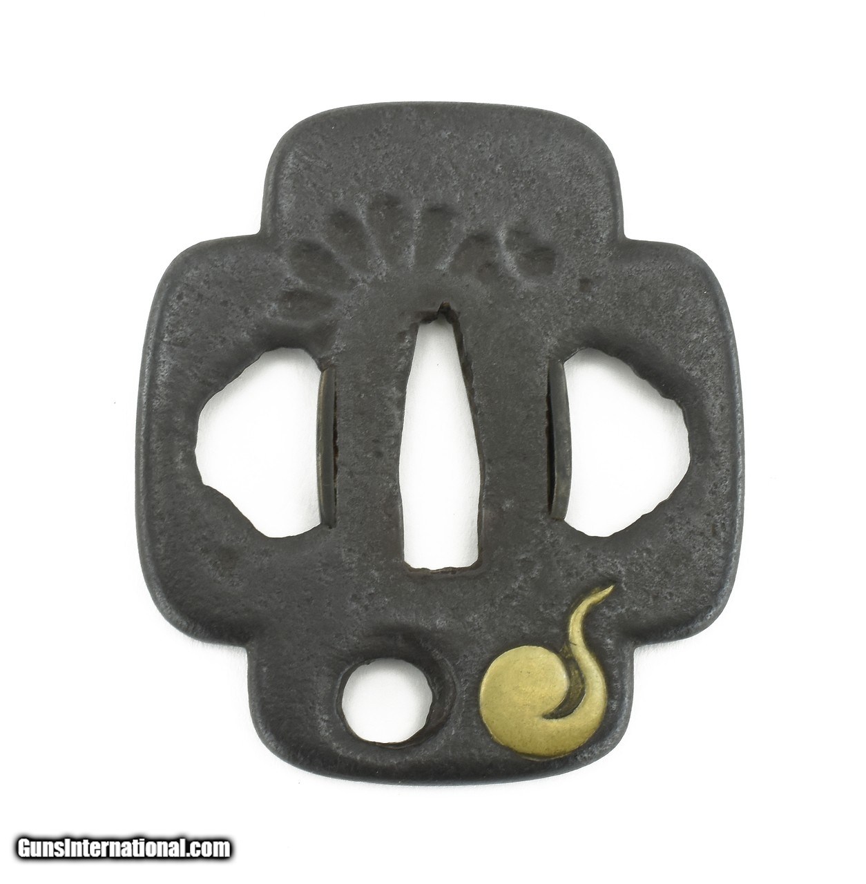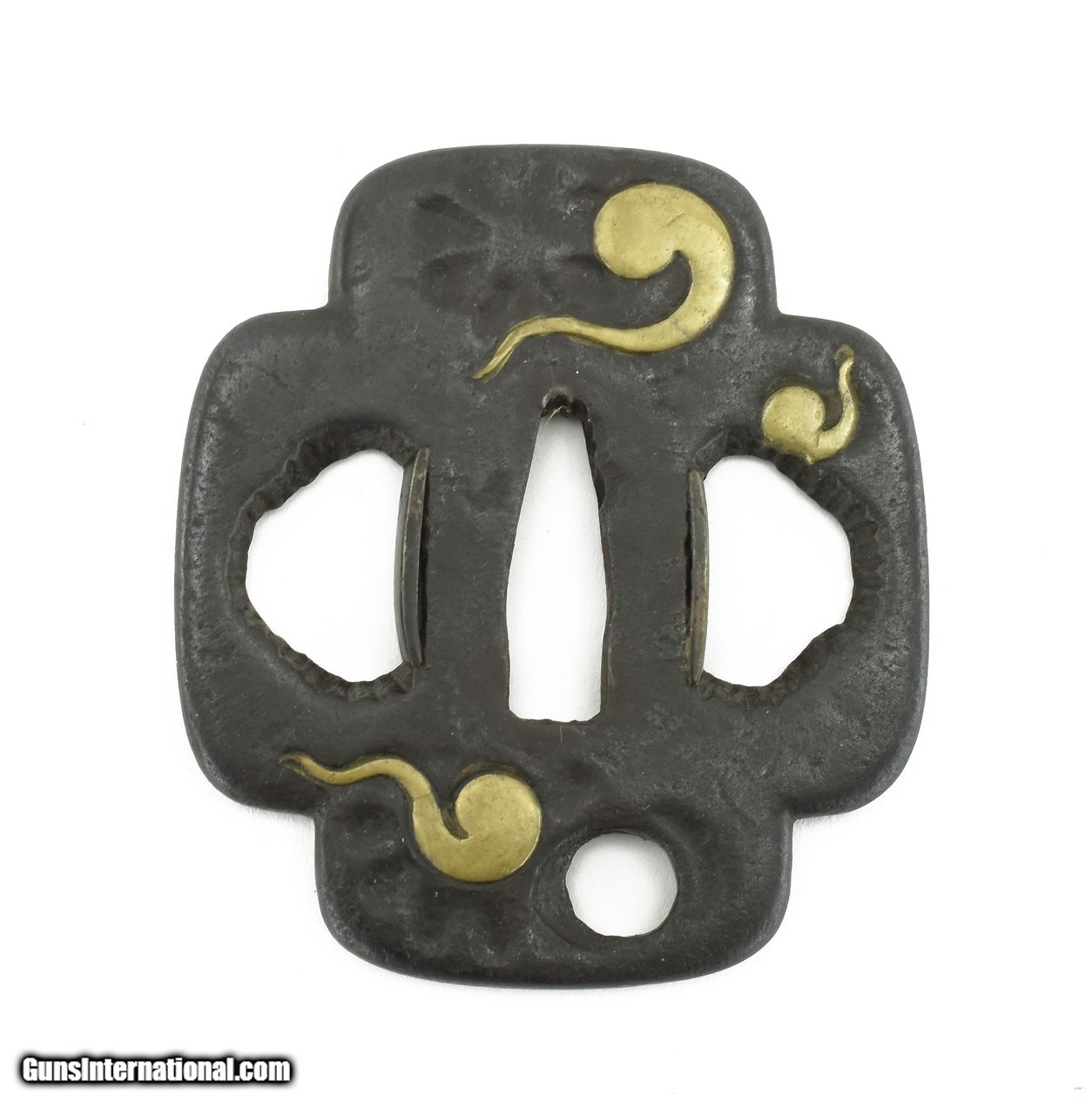 Description: "Iron Tsuba. Brass designs. Vertical dimension 3 1/8". Has nice patina. Possibly Muromachi period. SOLD |