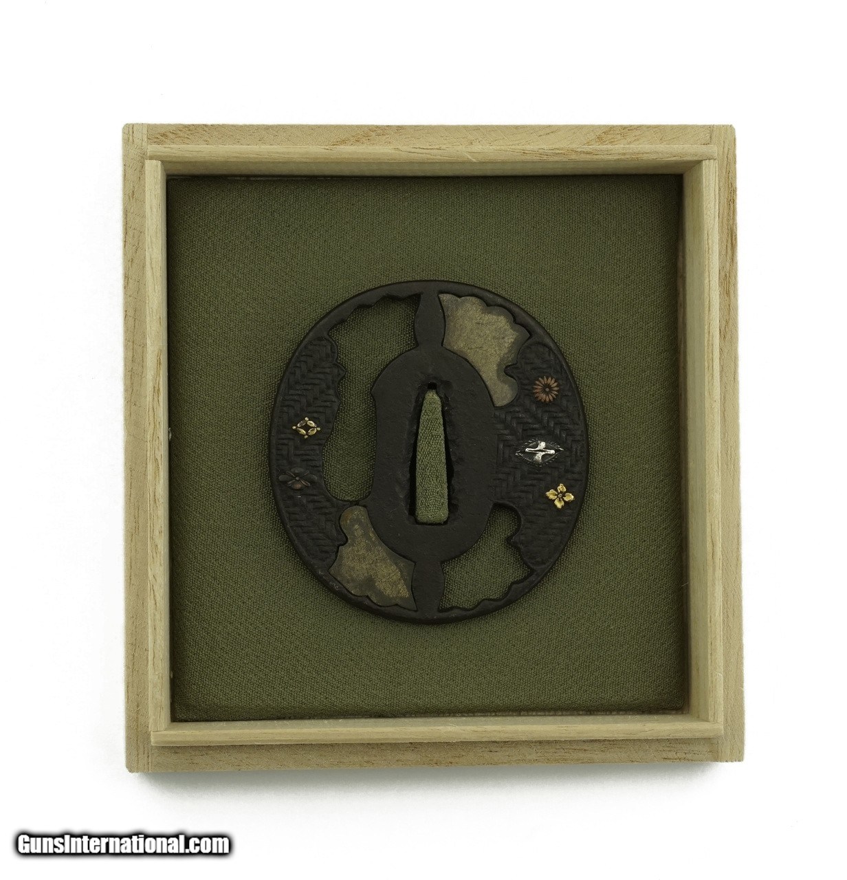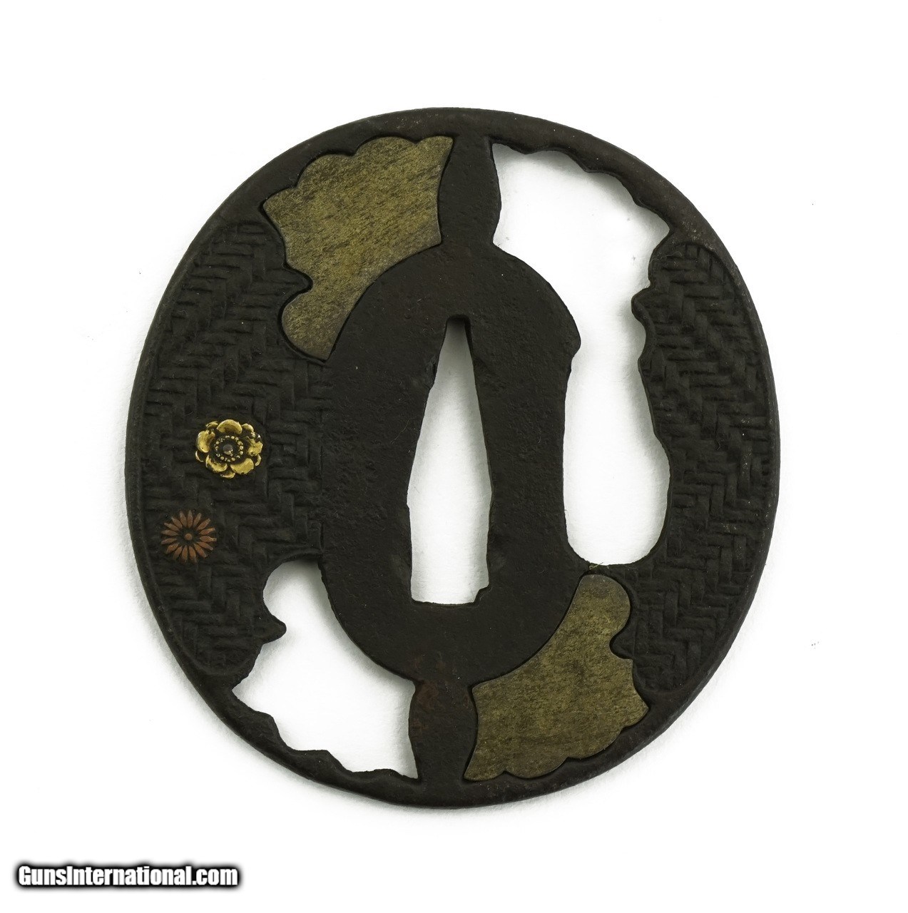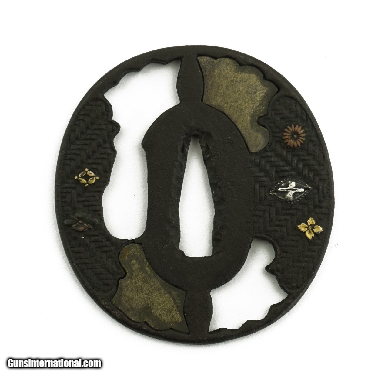 Description: "Iron Tsuba. Sukashi basket-weave with gold, silver and copper flowers. Unusual inserts. Vertical height 2 7/16" (6.4 cm). Unsigned. Boxed. SOLD |