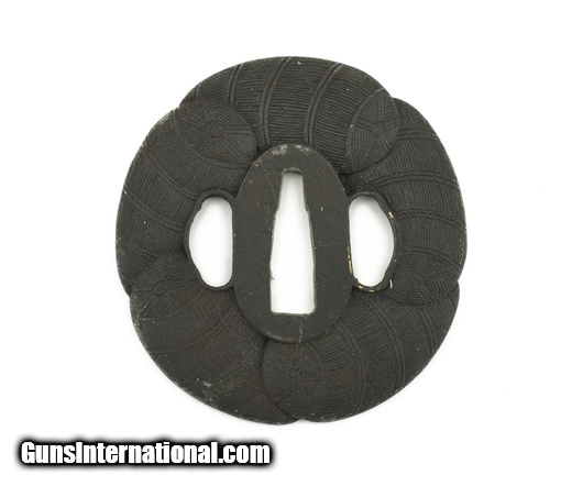 Description: "Iron Tsuba. Round with lobes. Basket weave pattern. Unsigned. Vertical height. 2 7/8" (7.4 cm). Boxed. SOLD |