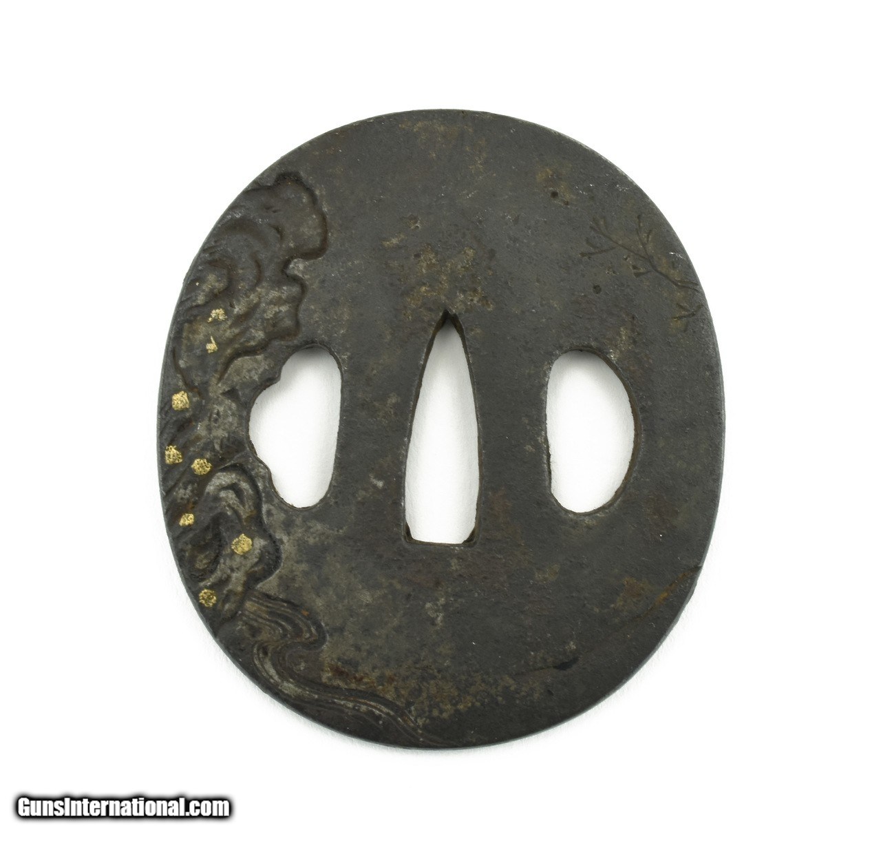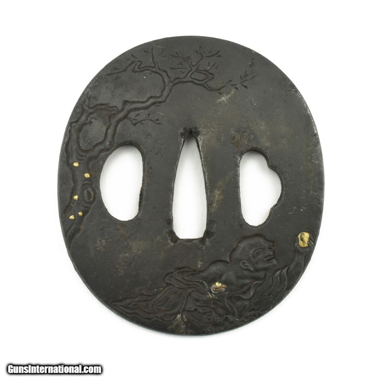 Description: "Iron Tsuba. Mythical character carrying Pearl of Wisdom under a tree with gold highlights.M Vertical height 2 13/16" (7.2 cm). SOLD |