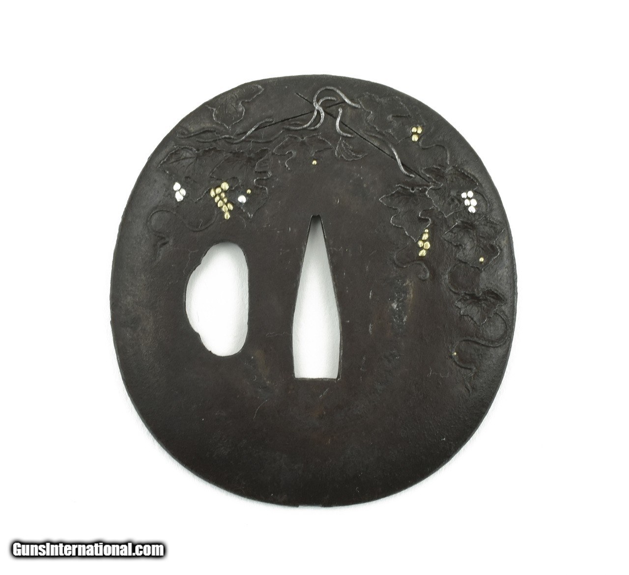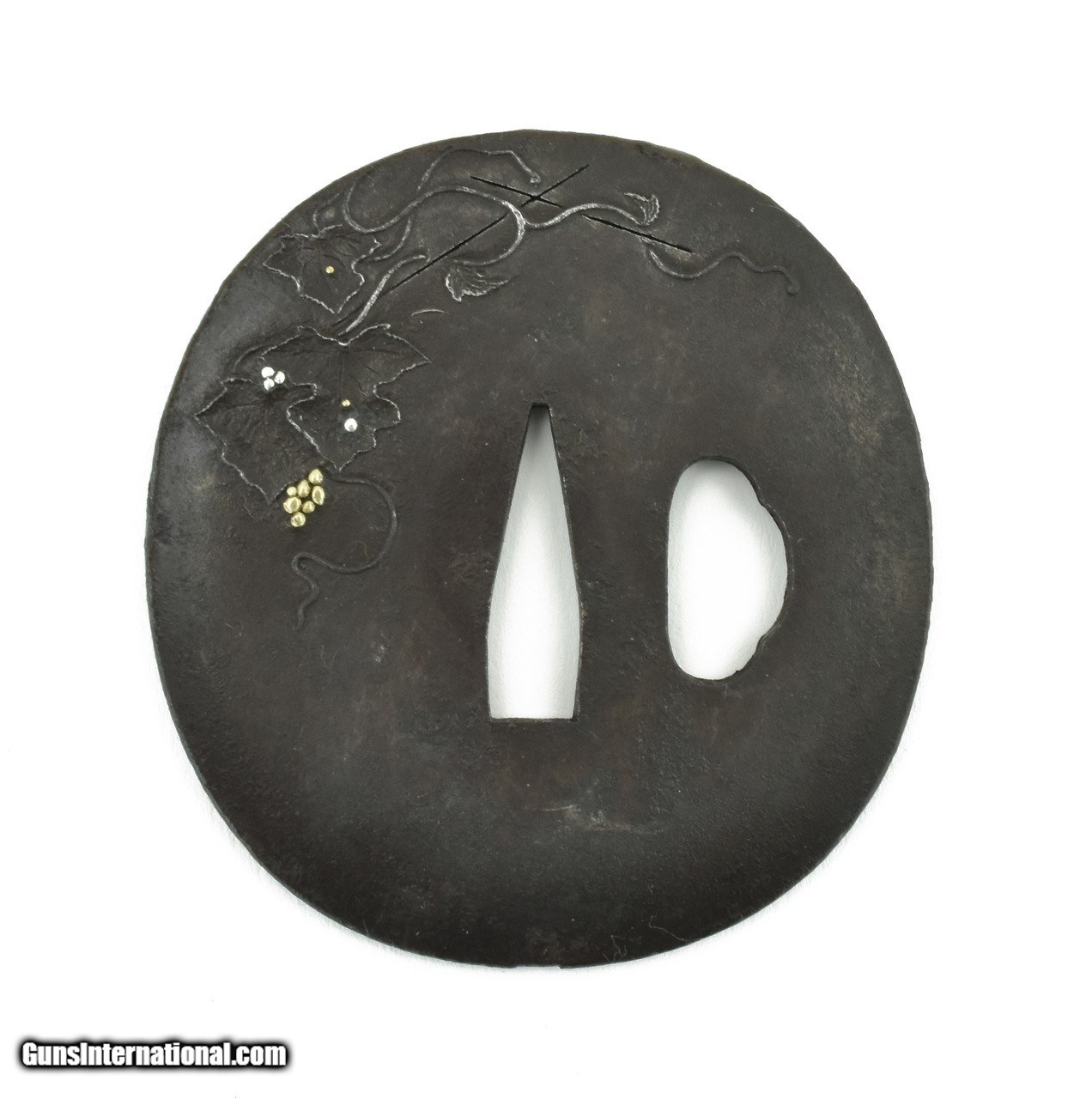 Description: "Iron Tsuba. Round or Maru Gata. Theme of flowers and tendrils with gold and silver highlights. Unsigned. Boxed. Vertical height 2 ¾" (7.2 cm). Wakizashi size. SOLD |