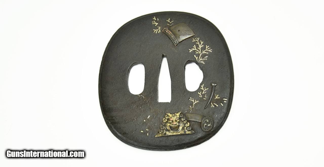 Description: "Iron Tsuba Motif of Fierce Horned Oni. Appears to be pieces of armor amidst branches of silver. Very good condition. 8,5cm 3 ½". SOLD |