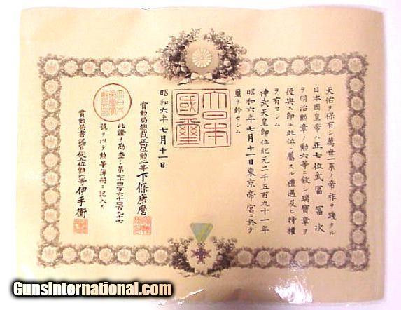 "Japanese Certificate - Order of the Sacred Treasure 6th Class