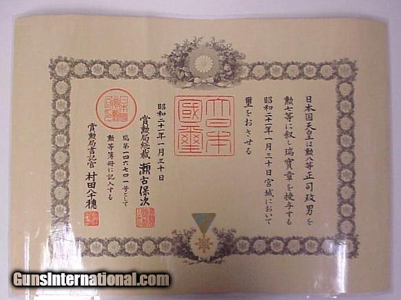 Description: "Japanese Certificate - Order of the Sacred Treasure 7th Class presentation certificate. SOLD |