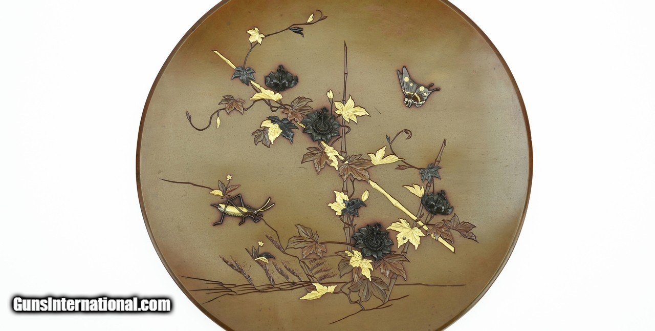 Description: "Japanese Meiji Period Shallow copper dish with beautiful inlays and overlays of bamboo, Copper, and gold leaves. There are also Shakudo Blossoms, a cricket, and butterfly in gold, Copper, and Shibuichi. This piece is unsigned. This type of Meiji art with mixed metal is characteristic of sword fittings artists who became unemployed after Emperor Meiji decreed that Samurai could no longer wear their swords. This decree actually gave rise to a wonderful art industry in mixed metal which appealed to be the Victorian taste. Diameter is 10 ¾" or 27.3cm. SOLD |