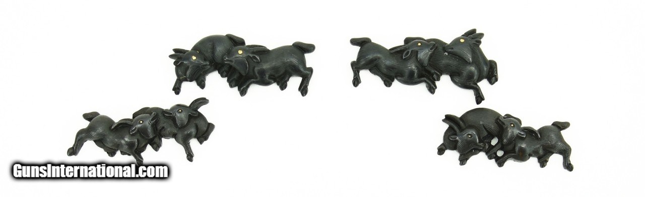 Description: "Kinko Dai-Sho Menuki. Shakudo with gold eyes on goats. SOLD |