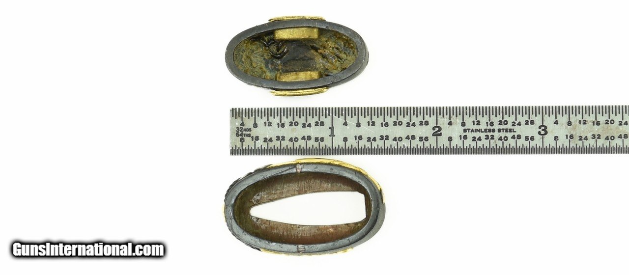 Description: "Kinko Fuchi Kashira and Kodzuka set. Shakudo nanako ground. Gold and shakudo cords with rings attached to a horse’s martingale. Kodzuka is signed: Goto with Kao. Possibly early Edo (1600-1700). SOLD |