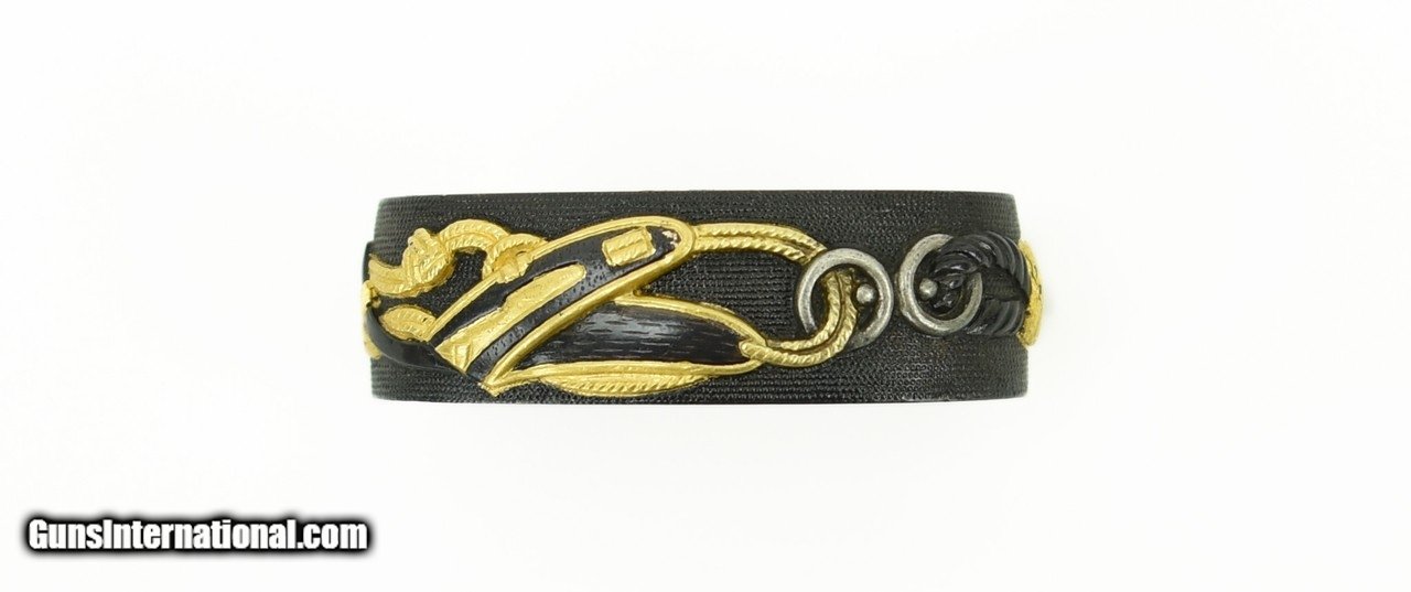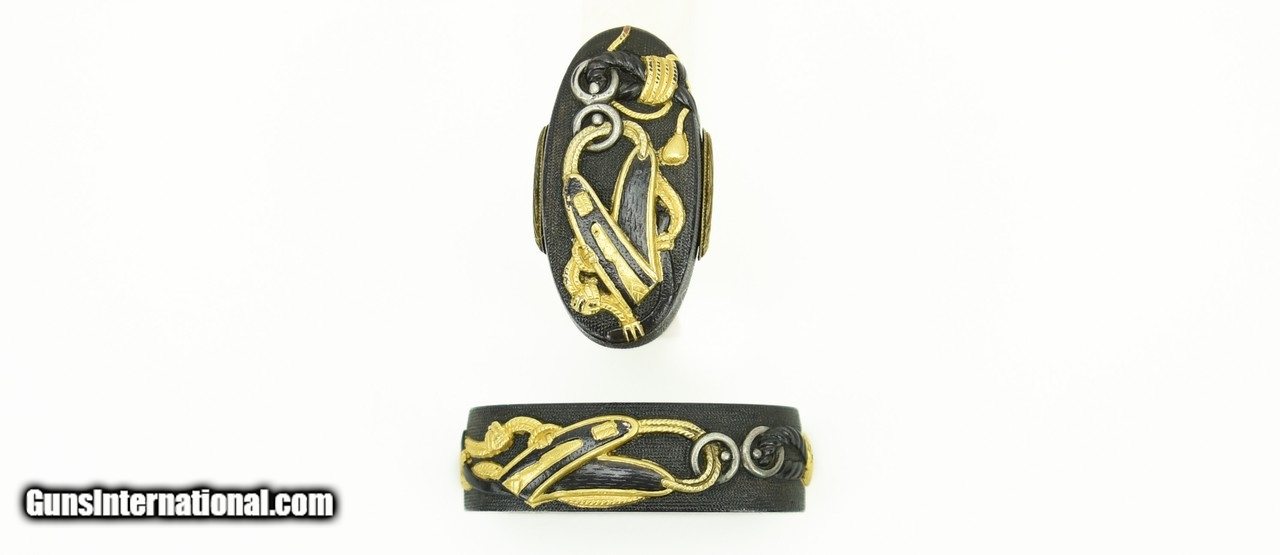 Description: "Kinko Fuchi Kashira and Kodzuka set. Shakudo nanako ground. Gold and shakudo cords with rings attached to a horse’s martingale. Kodzuka is signed: Goto with Kao. Possibly early Edo (1600-1700). SOLD |