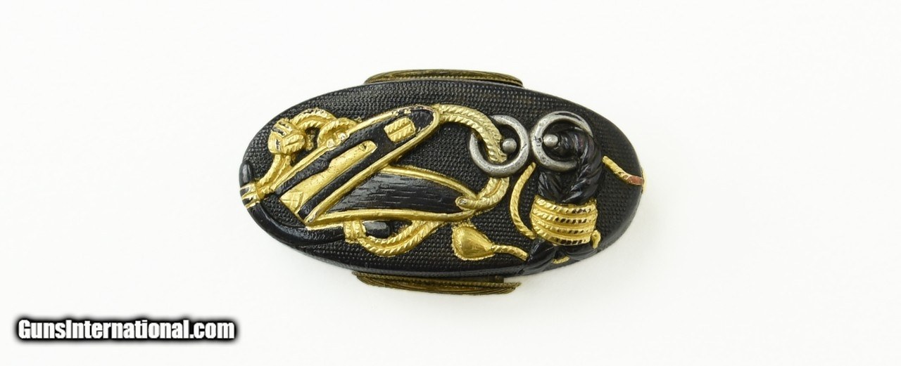 Description: "Kinko Fuchi Kashira and Kodzuka set. Shakudo nanako ground. Gold and shakudo cords with rings attached to a horse’s martingale. Kodzuka is signed: Goto with Kao. Possibly early Edo (1600-1700). SOLD |