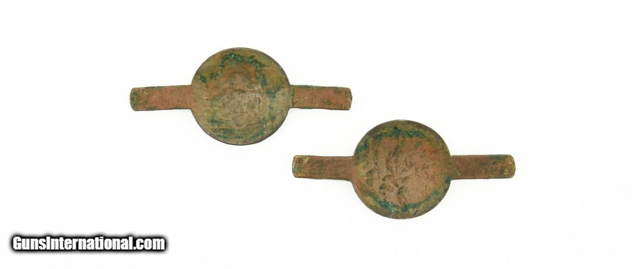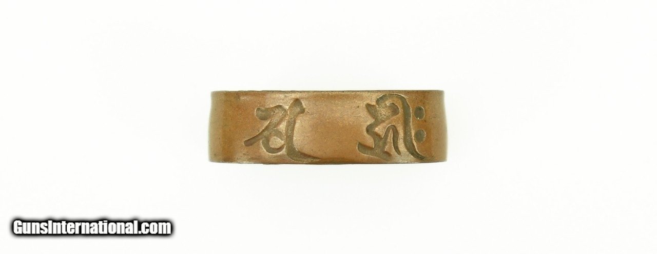 Description: "Kinko Fuchi Kashira and Menuki. Sanscrit theme. Copper with black shakudo highlights. SOLD |