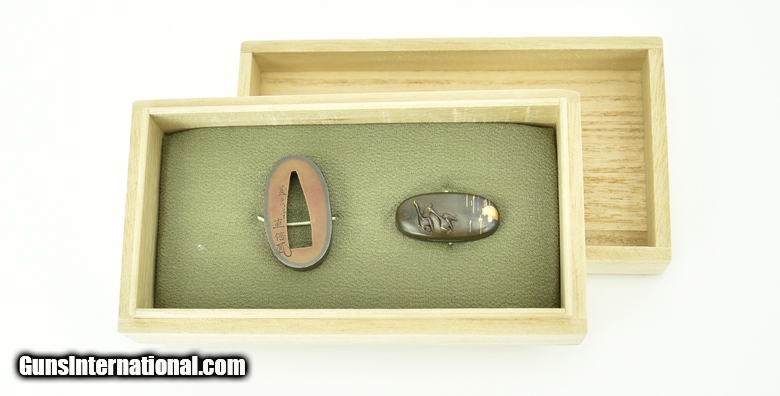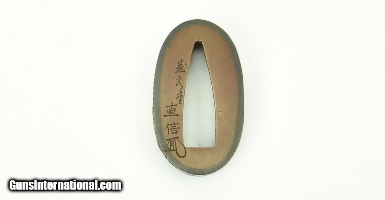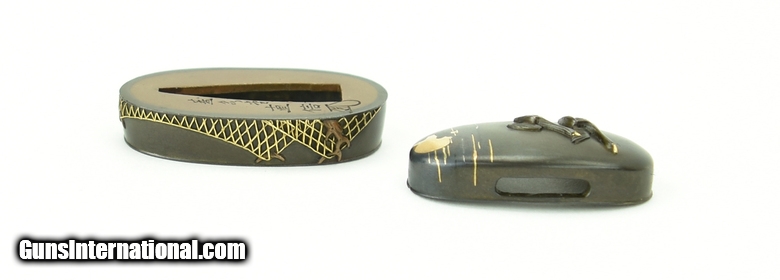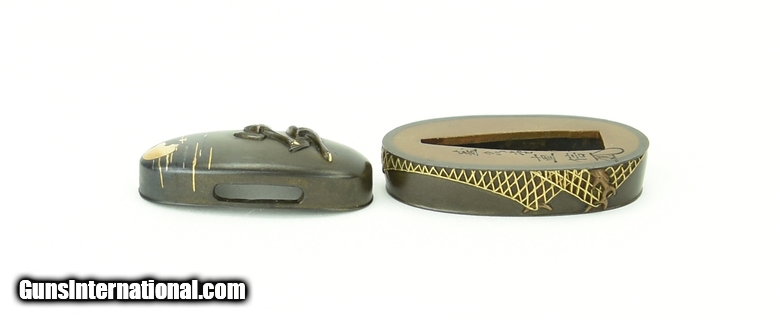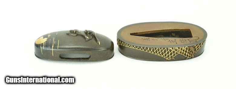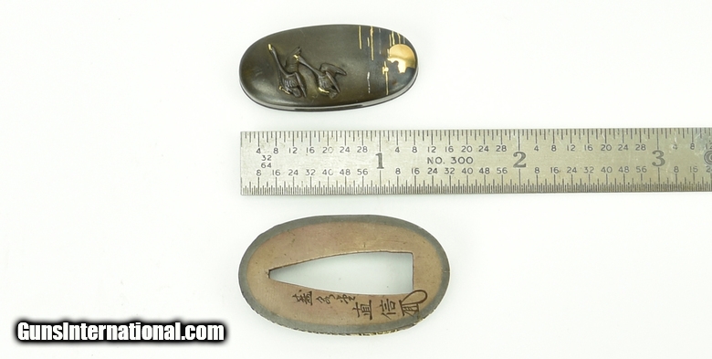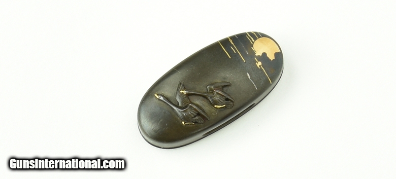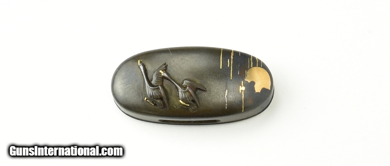 Description: "Kinko Fuchi-Kashira. Geese flying with moon and clouds in background. Signed Kashiwano Naga Nao. Native of takada. Pupil of Yoshi chika. Mid-19th Century. SOLD |