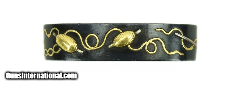 Description: "Kinko Fuchi Kashira Gold Spools and Thread with Knitting needles on Shakudo ground. Signed: Goto. SOLD |