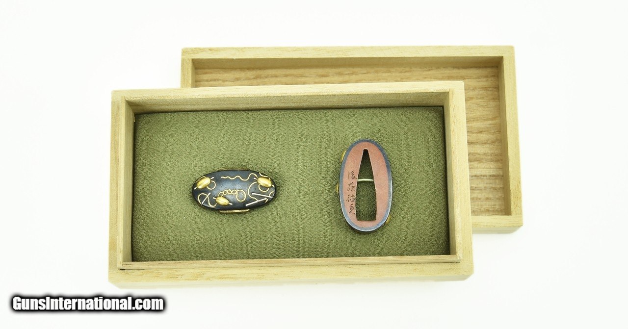 Description: "Kinko Fuchi Kashira Gold Spools and Thread with Knitting needles on Shakudo ground. Signed: Goto. SOLD |