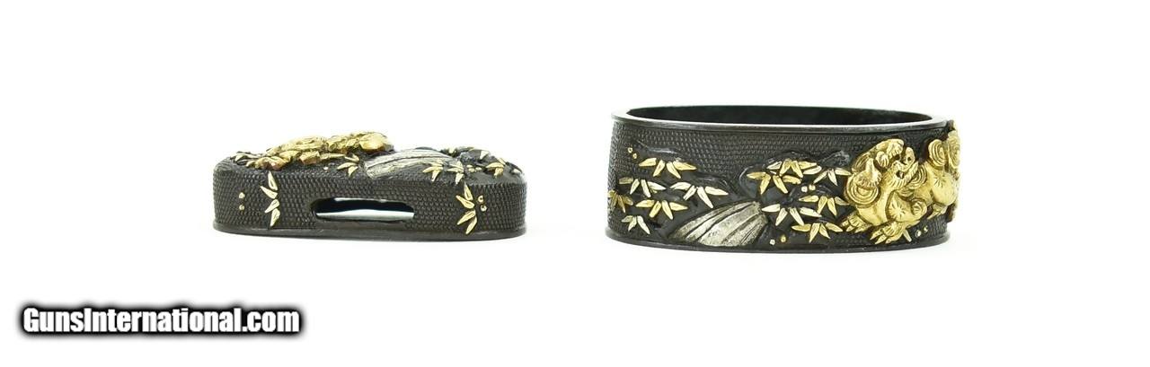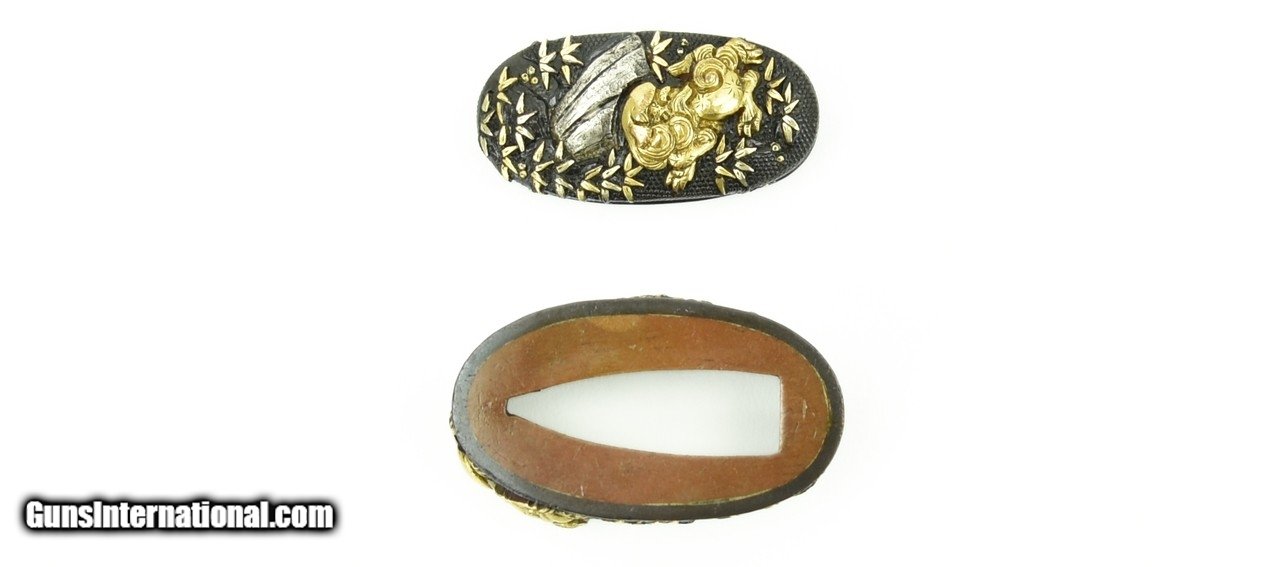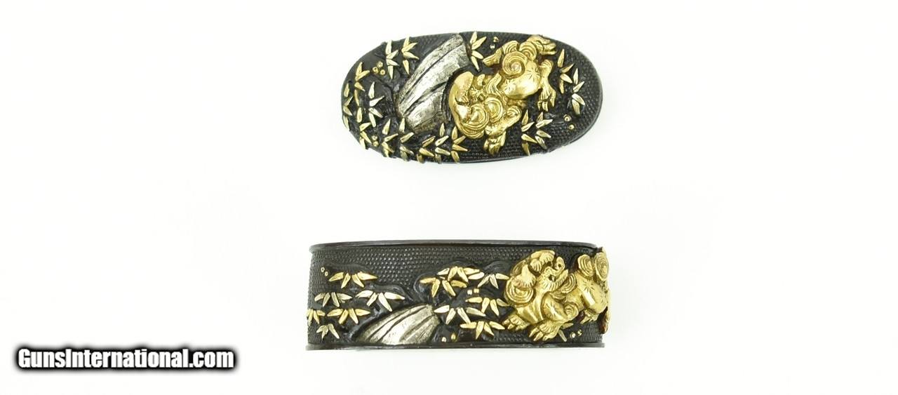 Description: "Kinko Fuchi Kashira. Decorated with a pair of Chinese Lions in bamboo by a waterfall. Shakudo nanako ground. Unsigned. SOLD |