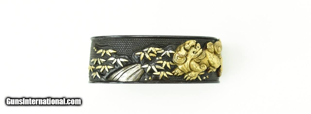 Description: "Kinko Fuchi Kashira. Decorated with a pair of Chinese Lions in bamboo by a waterfall. Shakudo nanako ground. Unsigned. SOLD |
