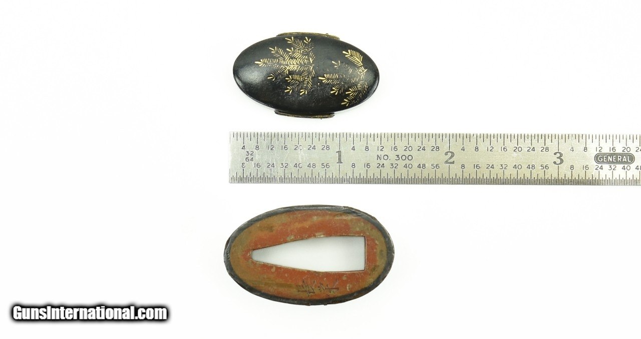 Description: "Kinko Fuchi Kashira. Shakudo set with young pine trees in mists in gold Hirazogan. Signed: Naga Saka. Kashira has small depression. SOLD |