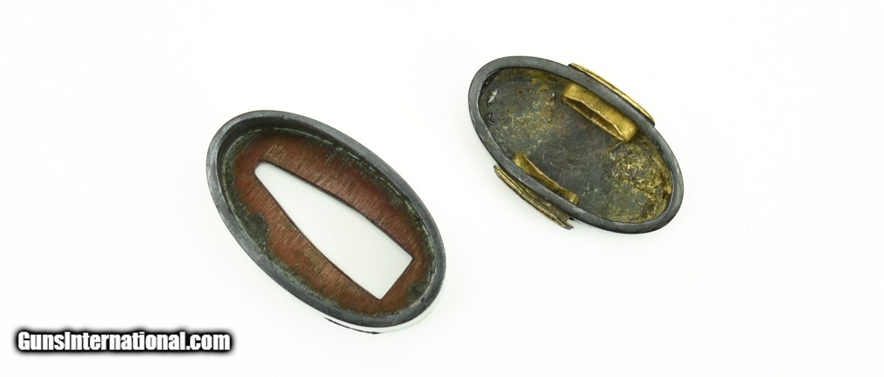 Description: "Kinko Fuchi Kashira. Shakudo set with young pine trees in mists in gold Hirazogan. Signed: Naga Saka. Kashira has small depression. SOLD |