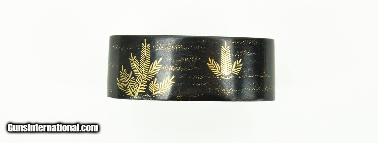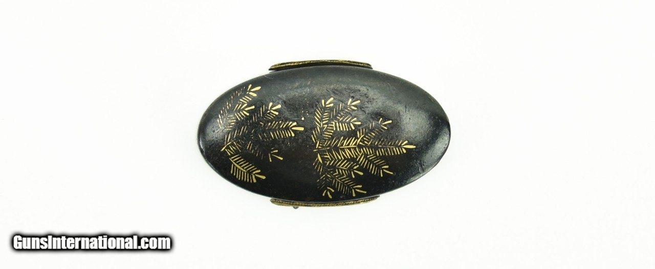 Description: "Kinko Fuchi Kashira. Shakudo set with young pine trees in mists in gold Hirazogan. Signed: Naga Saka. Kashira has small depression. SOLD |