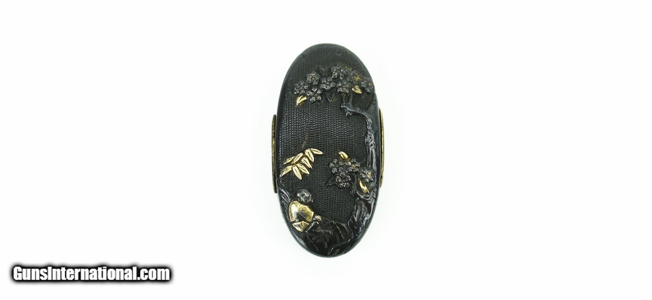 Description: "Kinko Fuchi Kashira. Tree with flowering fruit, figure resting on a rock with foliage in gold. Shakudo nanako ground. Signed. SOLD |