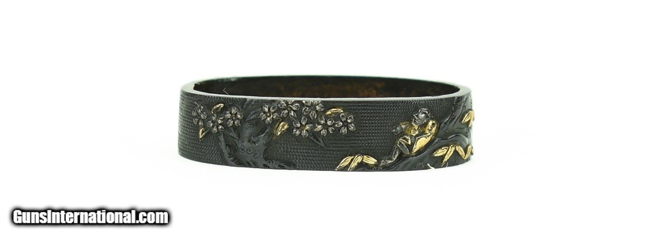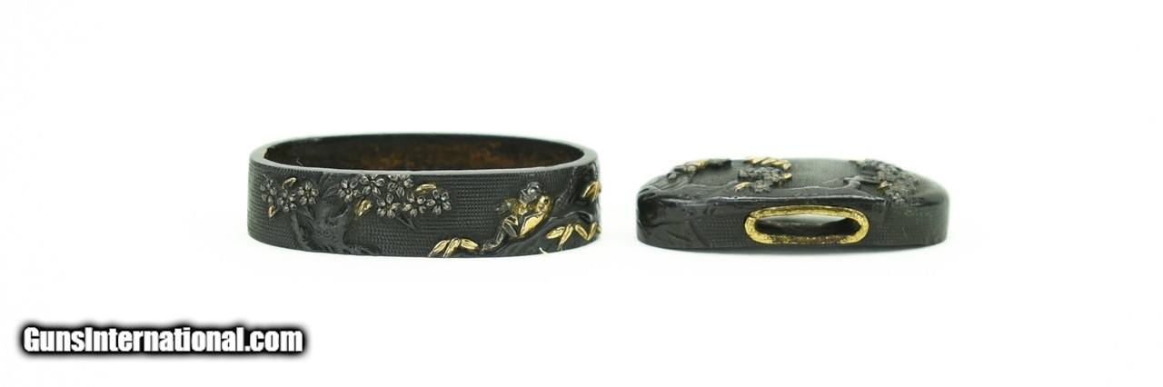 Description: "Kinko Fuchi Kashira. Tree with flowering fruit, figure resting on a rock with foliage in gold. Shakudo nanako ground. Signed. SOLD |