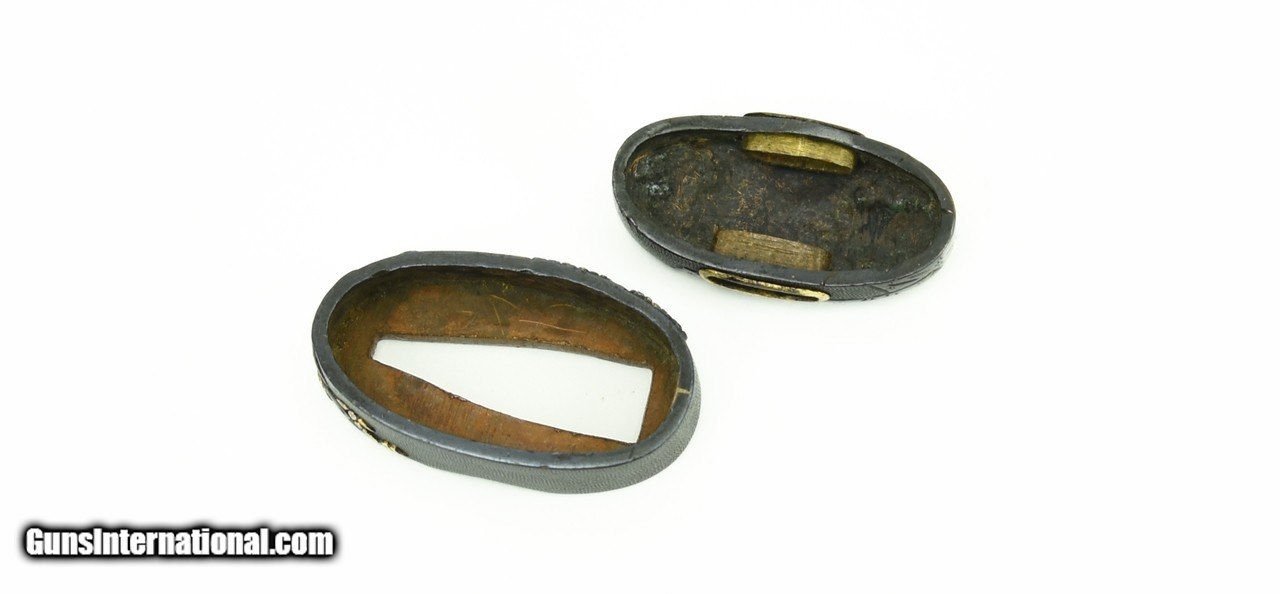 Description: "Kinko Fuchi Kashira. Tree with flowering fruit, figure resting on a rock with foliage in gold. Shakudo nanako ground. Signed. SOLD |