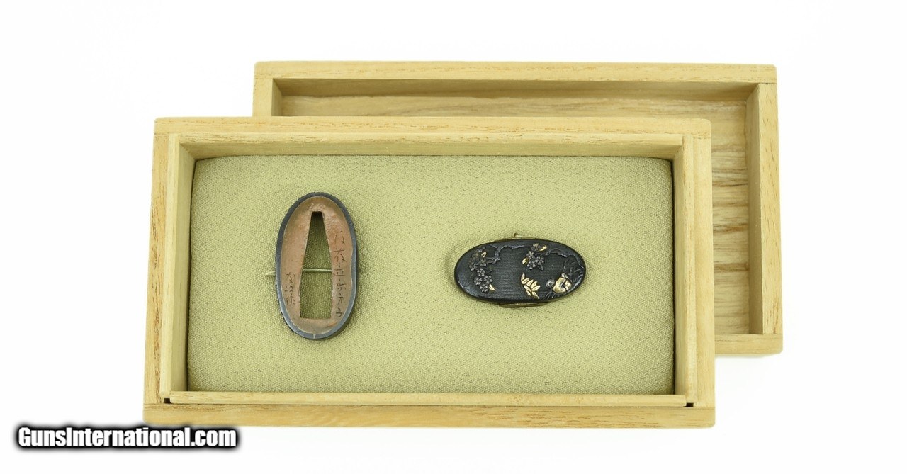 Description: "Kinko Fuchi Kashira. Tree with flowering fruit, figure resting on a rock with foliage in gold. Shakudo nanako ground. Signed. SOLD |