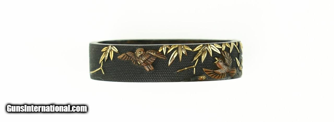 Description: "Kinko Fuchi Kashira. Birds and flora with shakudo nanako ground. Gold, shakudo, and copper highlights. Unsigned. Tanto size. SOLD |