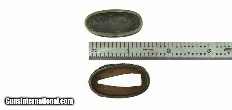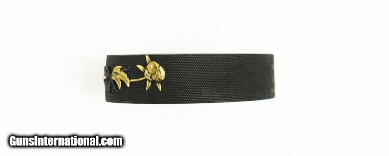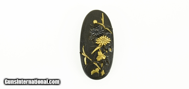 Description: "Kinko Fuchi Kashira. Shakudo nanako ground. Gold and shakudo flowers. Unsigned. Finely cut. SOLD |