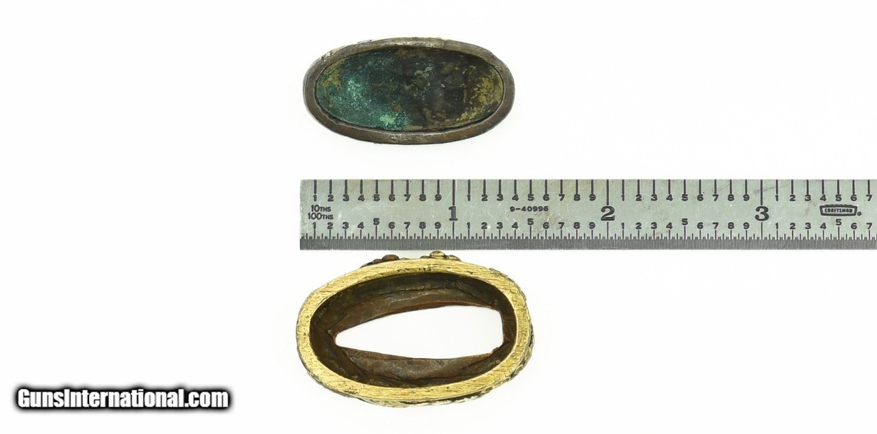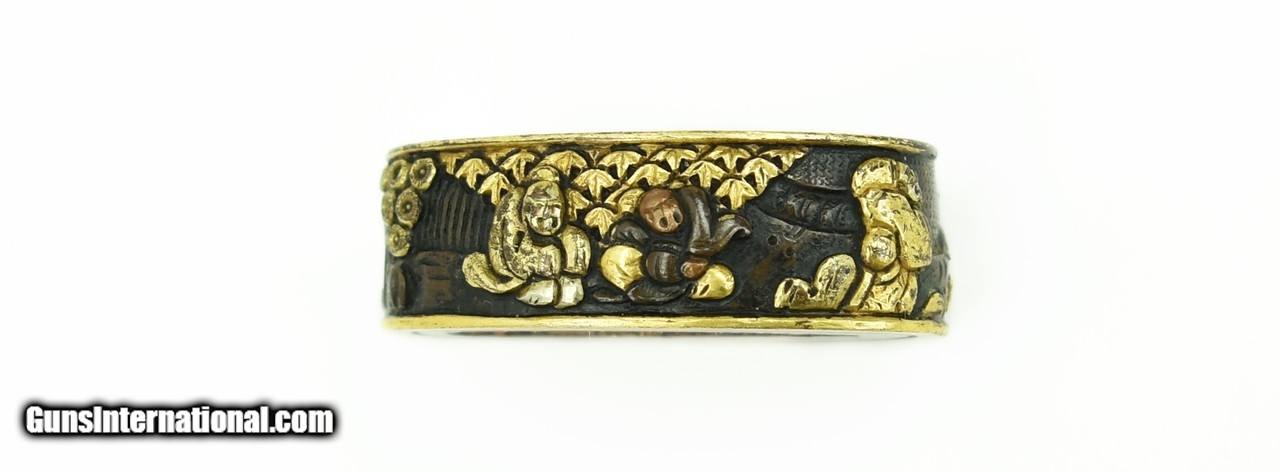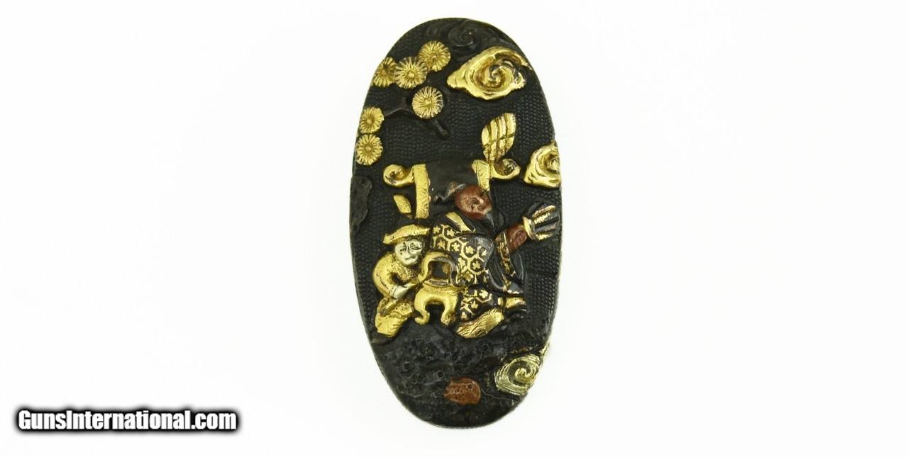 Description: "Kinko Fuchi Kashira. Shakudo nanako ground. Robed scholars with gold silver, shakudo, and copper highlights. Unsigned. SOLD |
