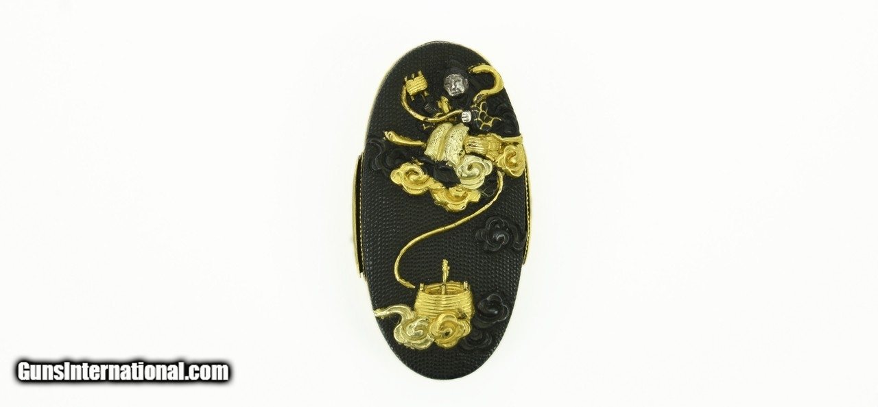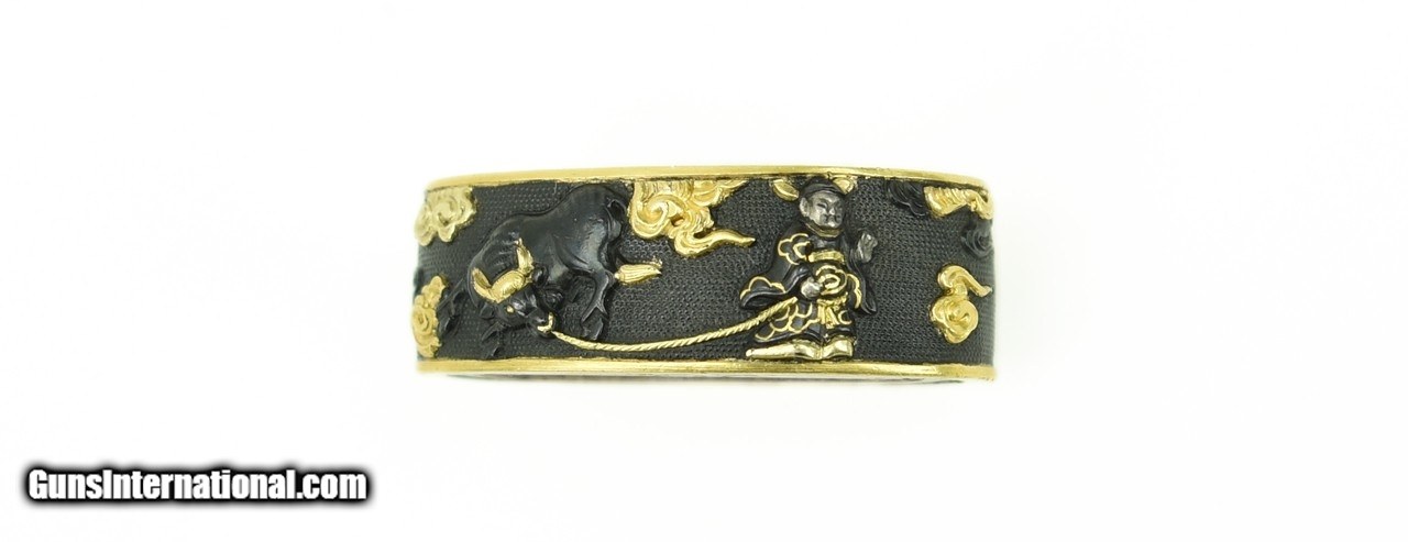 Description: "Kinko Fuchi Kashira. Shakudo nanako ground. Decorated with figure among the clouds, and figure leading an ox. Shakudo, silver, and gold highlights. First half 18th Century. Signed: Naga Mine (lived in Kyoto). Very fine detail. SOLD |