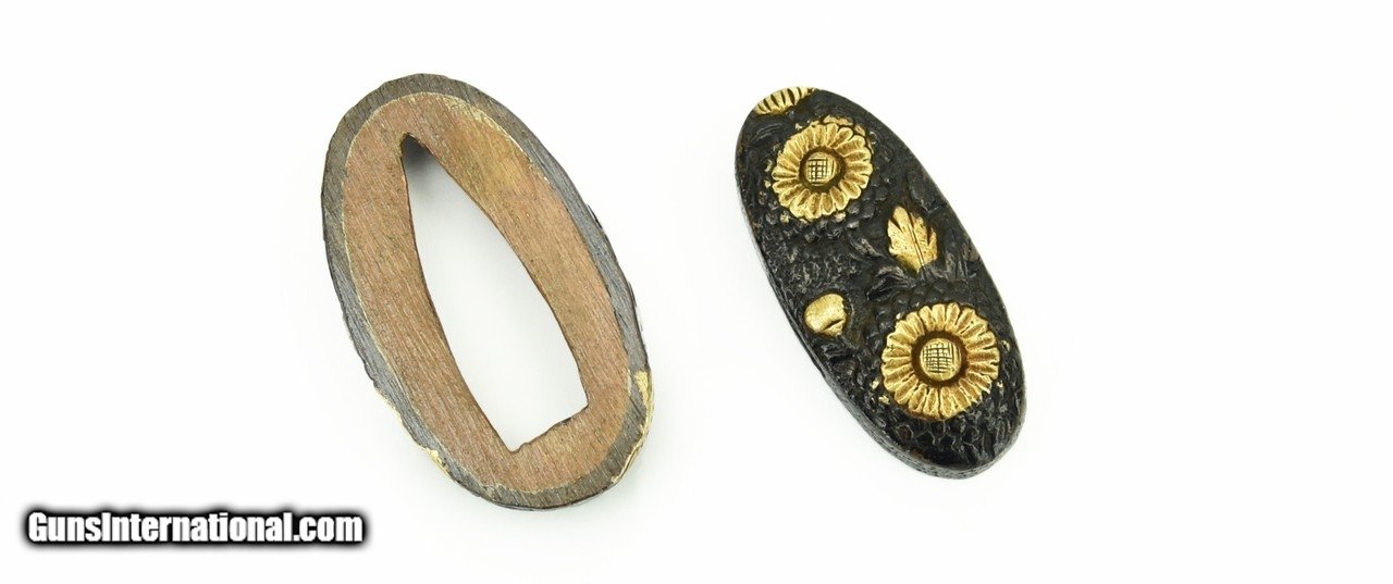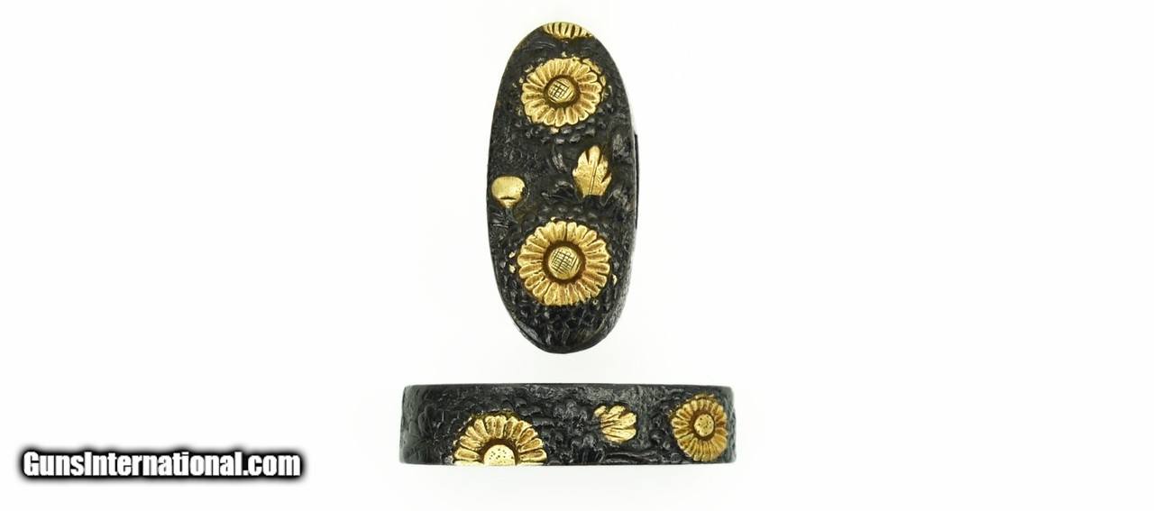 Description: "Kinko Fuchi Kashira. Shakudo ishime ground. Gold and shakudo flowers. Unsigned. SOLD |