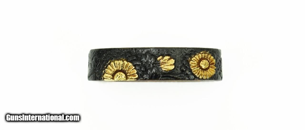 Description: "Kinko Fuchi Kashira. Shakudo ishime ground. Gold and shakudo flowers. Unsigned. SOLD |