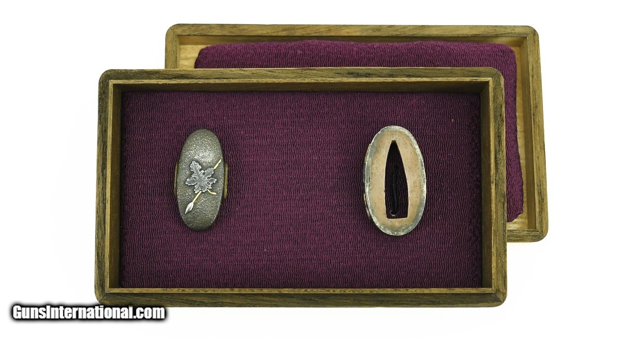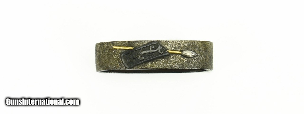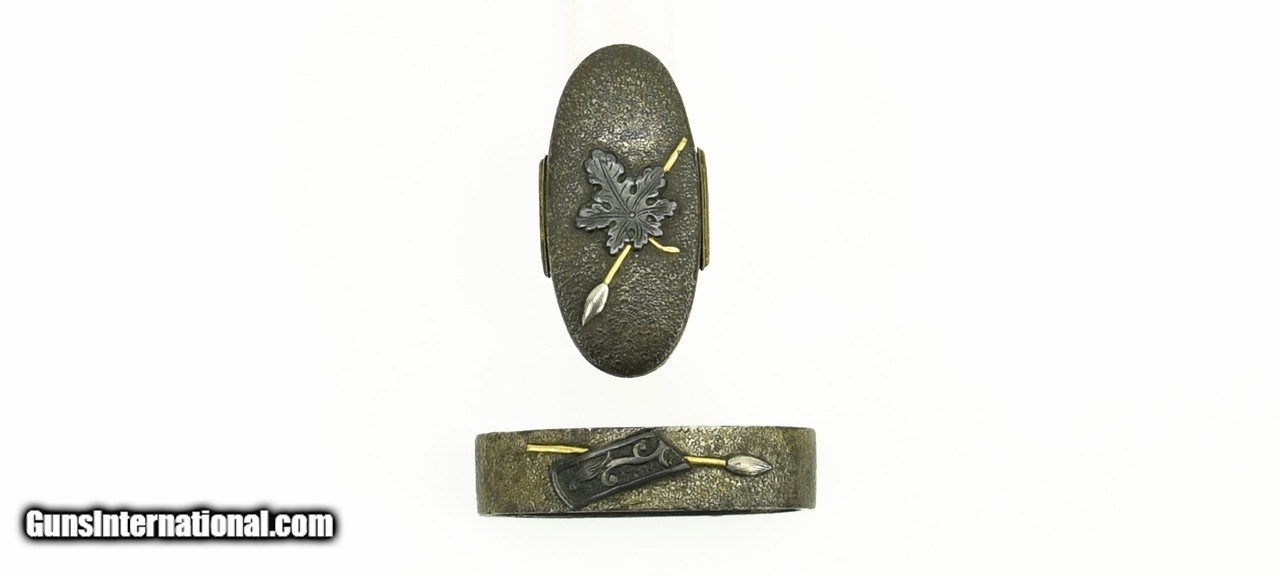 Description: "Kinko Fuchi Kashira. Shakudo with “crepe" stone ground. Motif is of gold and silver lances with shakudo tendrils and leaves. Unsigned. SOLD |