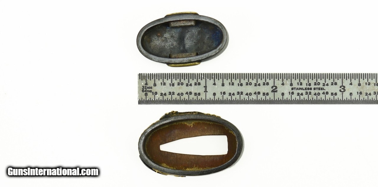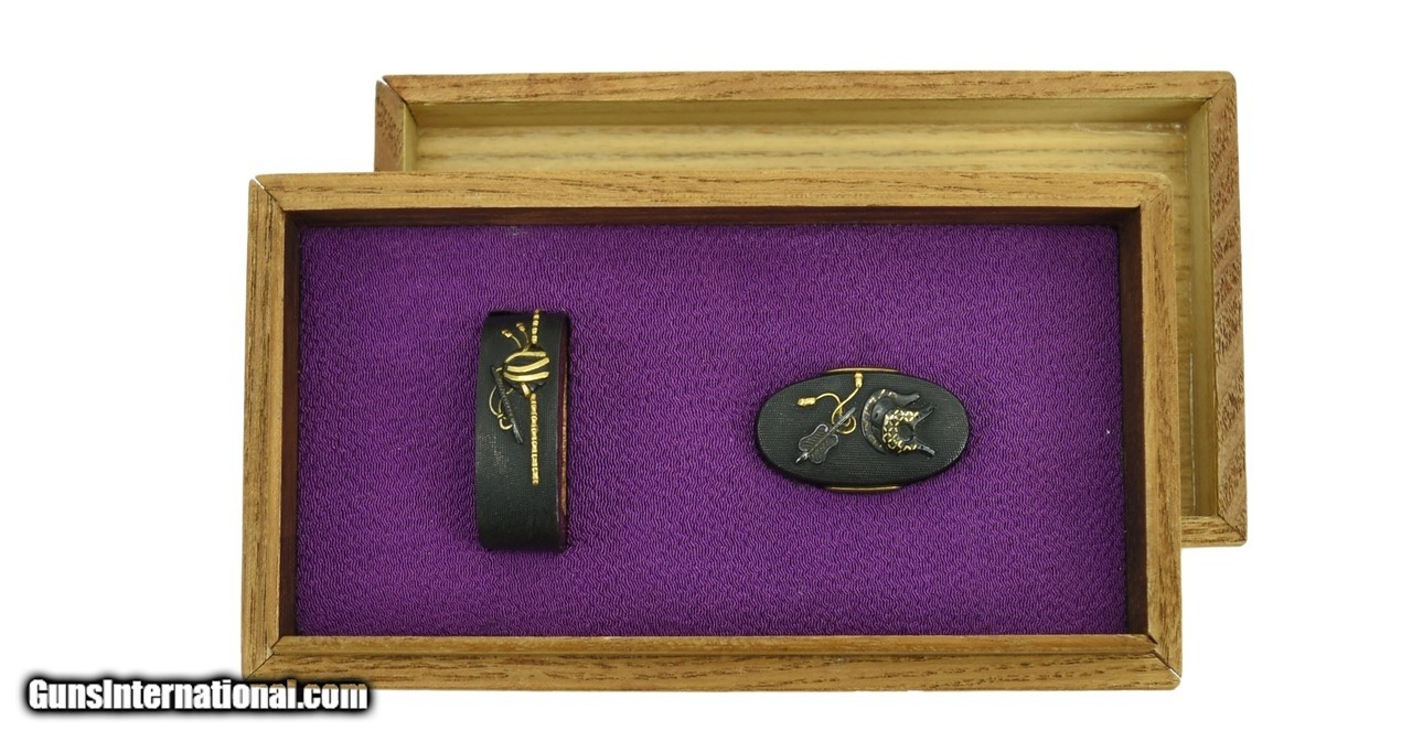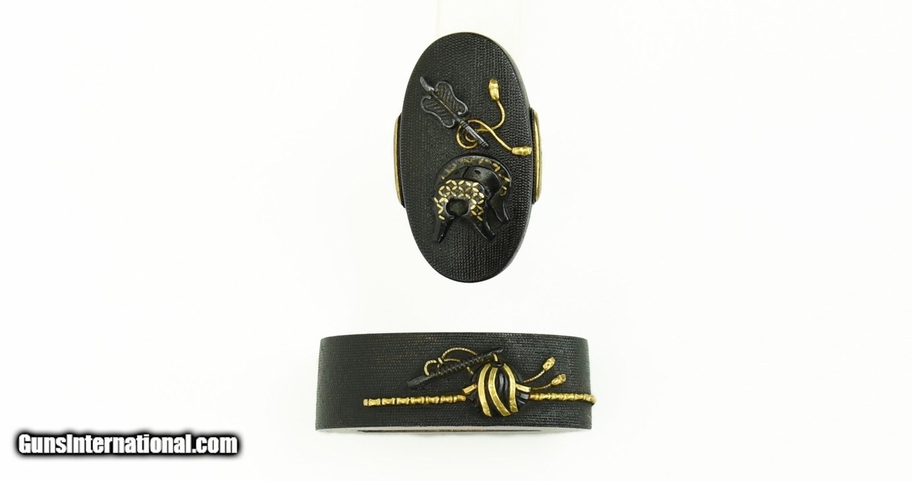 Description: "Kinko Fuchi Kashira. Shakudo nanako ground. Decorated with saddle, signal baton, war fan, and riding crop. Comes with custom box. Unsigned. Katana size. SOLD |