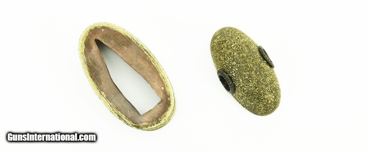 Description: "Kinko Fuchi Kashira. Copper finished in rough surface texture and decorated in gilt. Unsigned. SOLD |