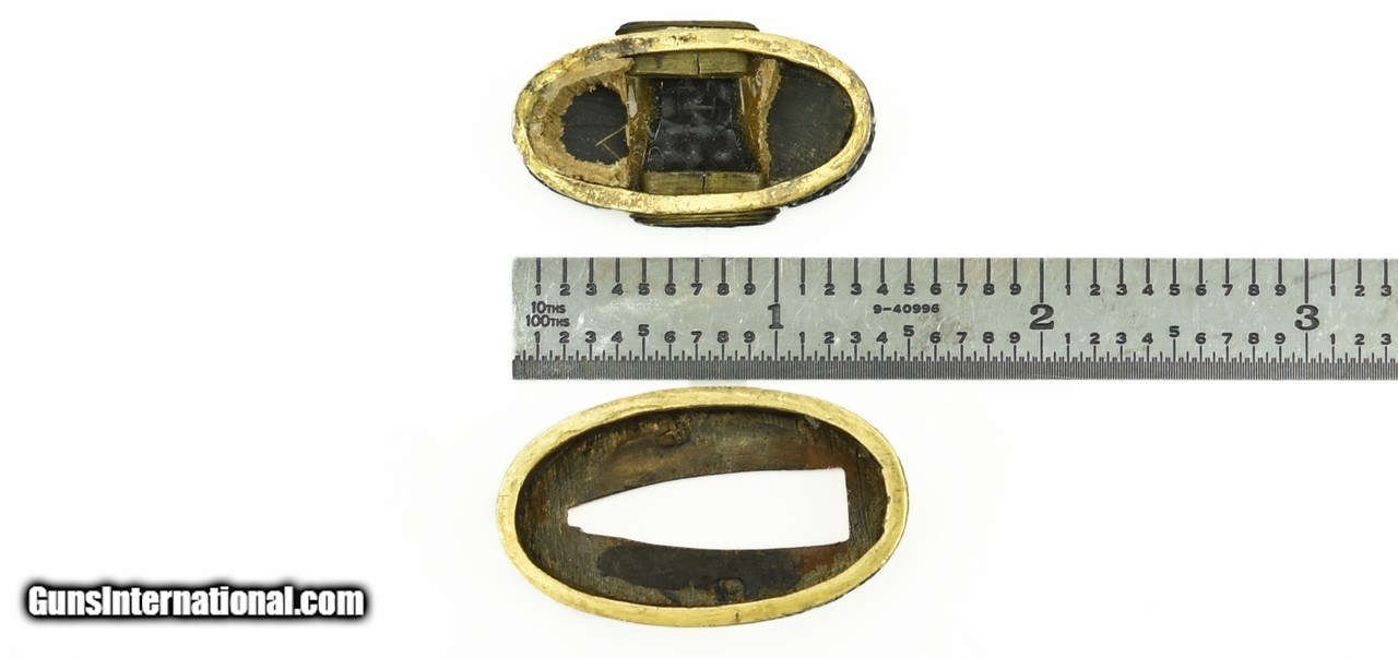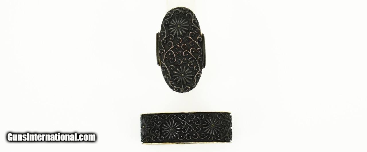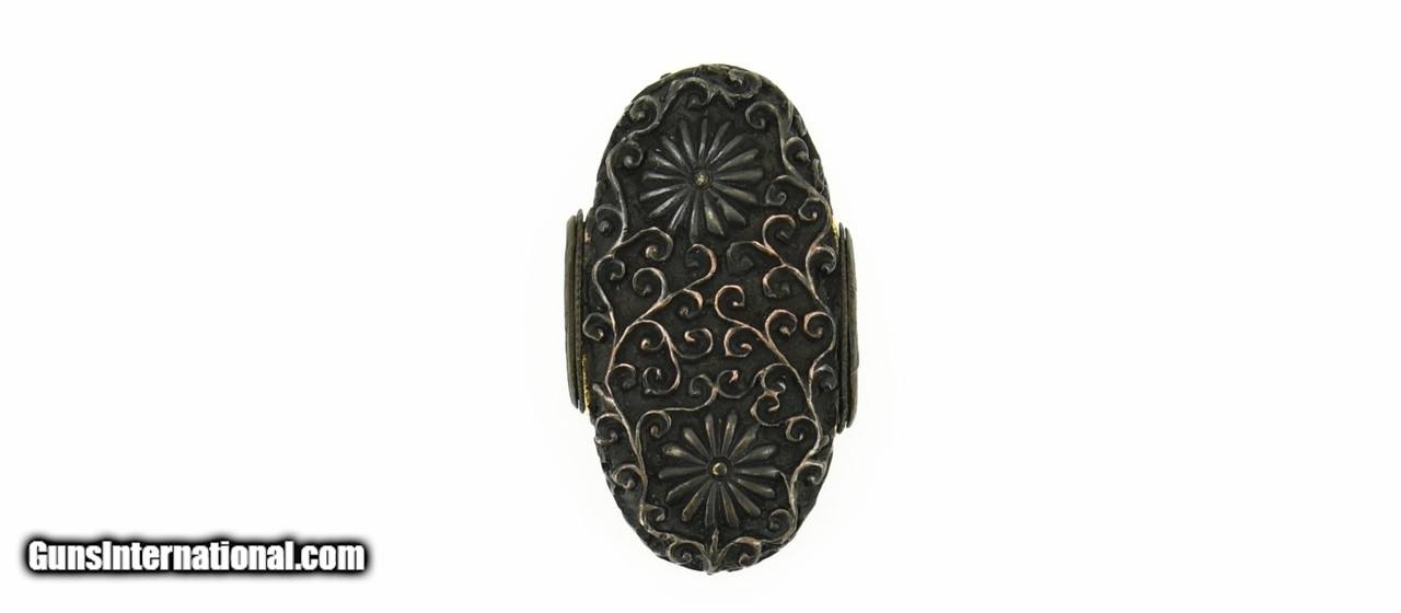 Description: "Kinko Fuchi Kashira. Deeply carved chrysanthemums and scrolling vines in shakudo. Unsigned. SOLD |