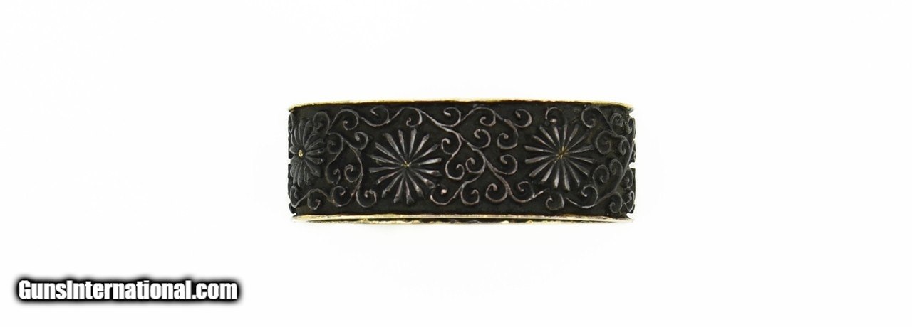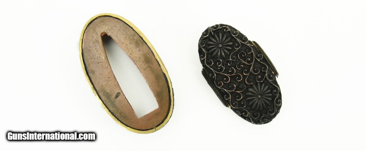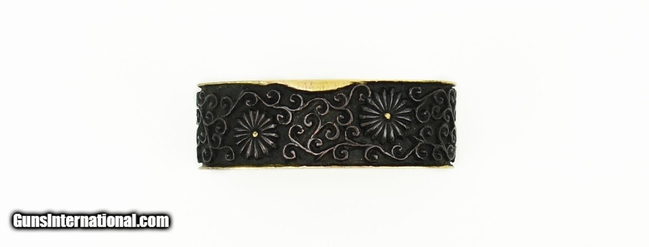 Description: "Kinko Fuchi Kashira. Deeply carved chrysanthemums and scrolling vines in shakudo. Unsigned. SOLD |