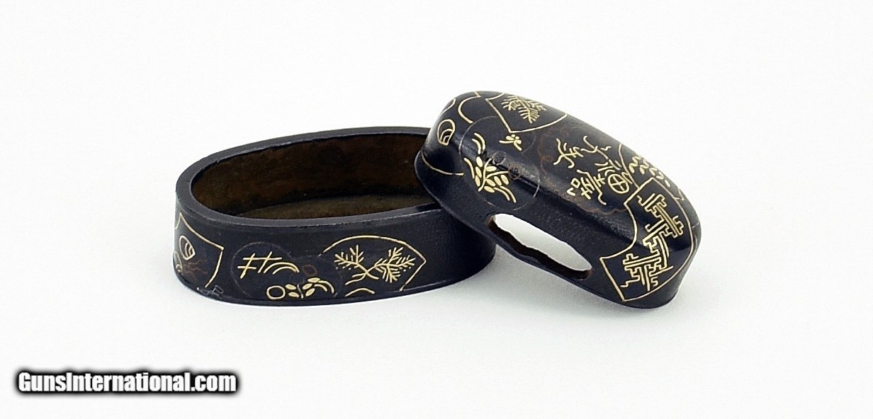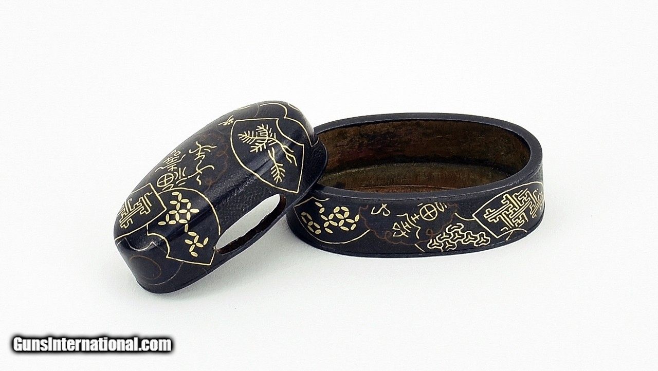 Description: "Kinko Fuchi Kashira. Polished shakudo ground. Gold inlay. Unsigned. Tanto size or wakizashi size. SOLD |