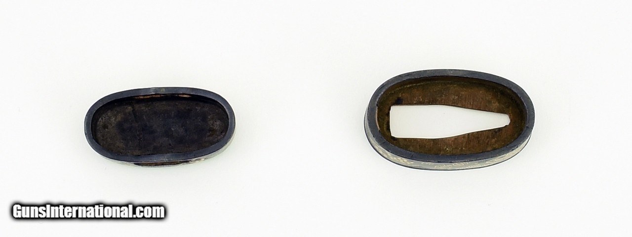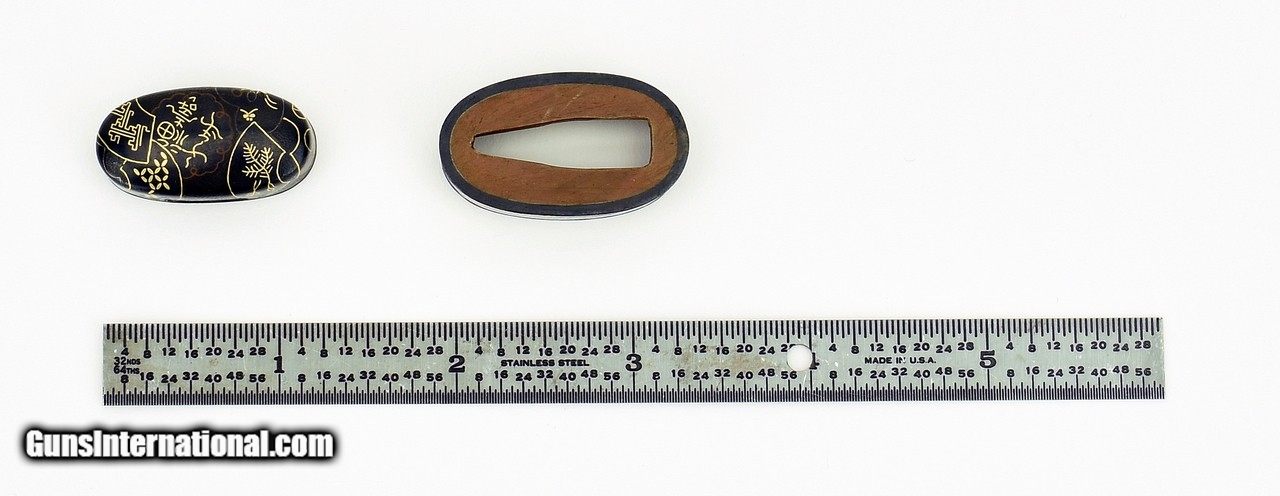 Description: "Kinko Fuchi Kashira. Polished shakudo ground. Gold inlay. Unsigned. Tanto size or wakizashi size. SOLD |