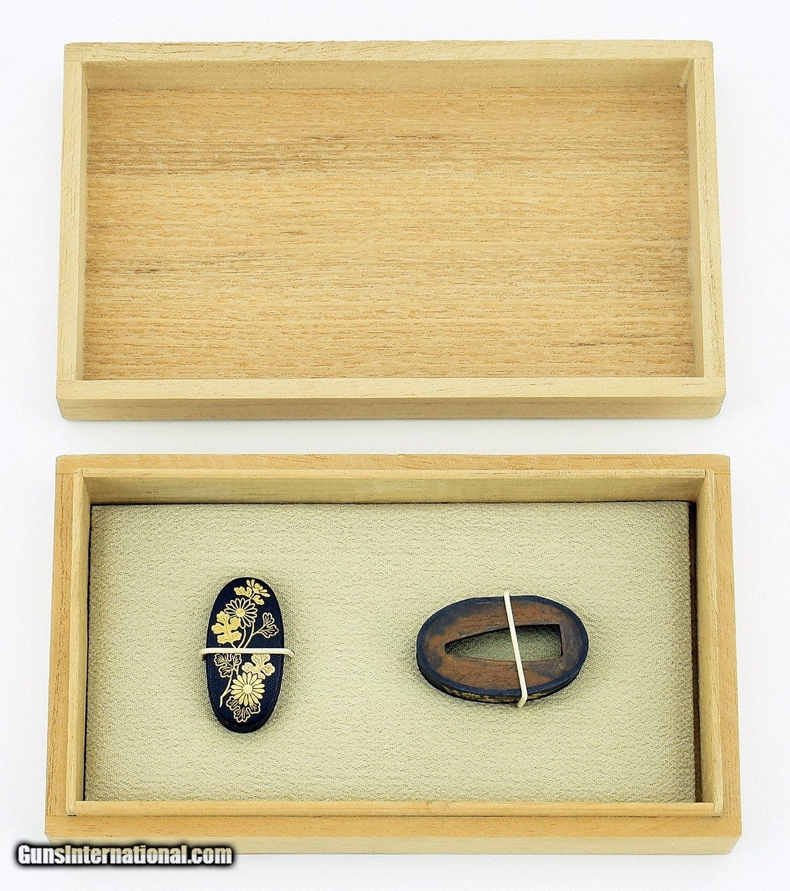 Description: "Kinko Fuchi Kashira. Shakudo nanako ground. Blossoms and leaves in gold. Unsigned. Excellent condition. SOLD |