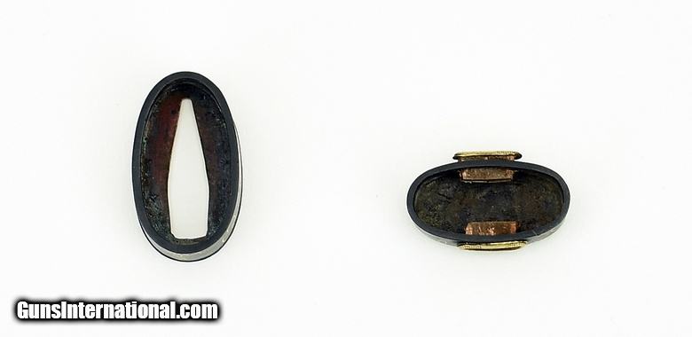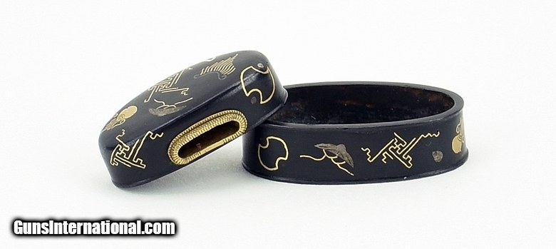 Description: "Kinko Fuchi Kashira. Polished shakudo ground. Gold and silver inlay. Unsigned. Tanto size. Custom box. SOLD |