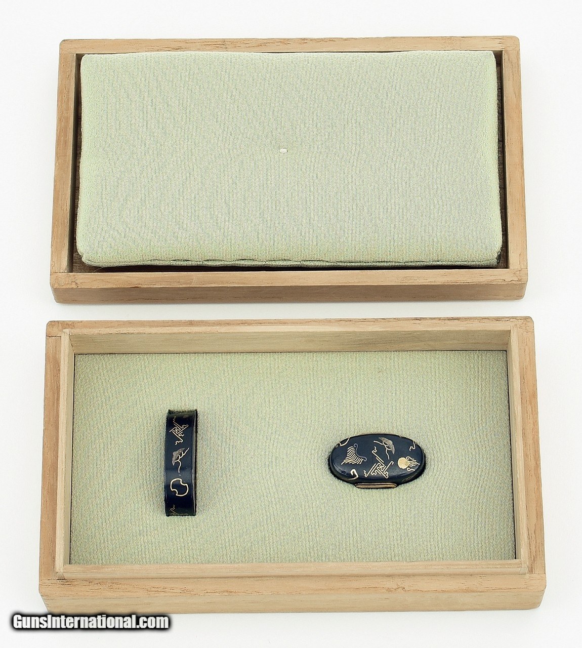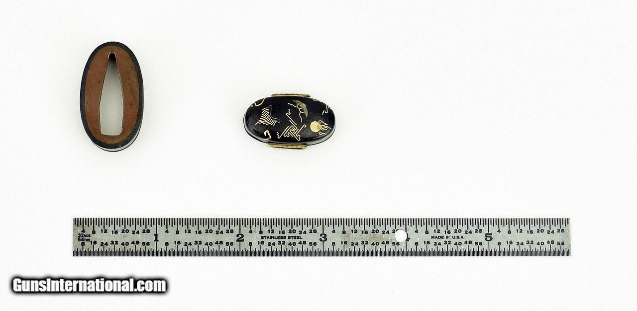 Description: "Kinko Fuchi Kashira. Polished shakudo ground. Gold and silver inlay. Unsigned. Tanto size. Custom box. SOLD |