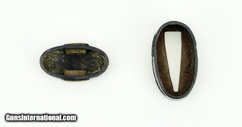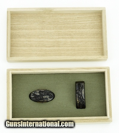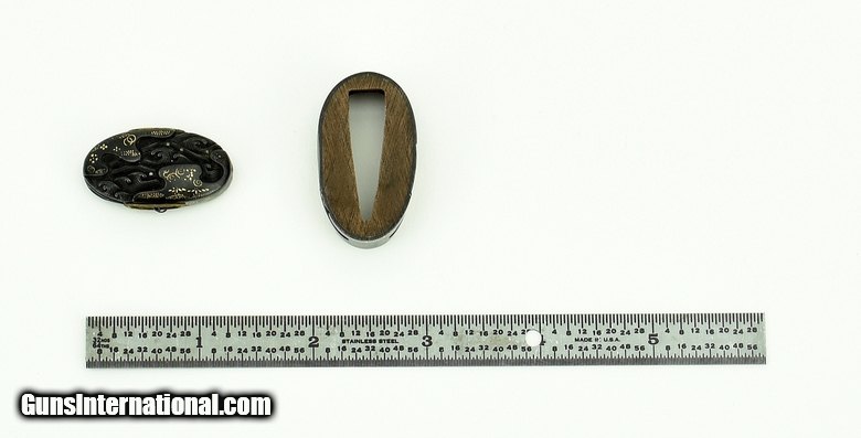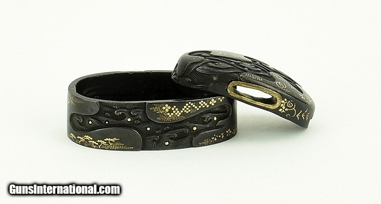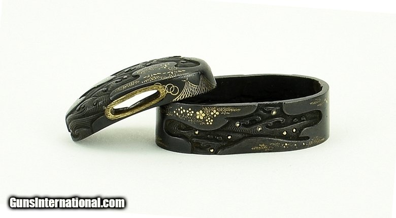 Description: "Kinko Fuchi Kashira. Polished shakudo ground. Wave motif with exceptional fine gold inlay. Unsigned. Very unusual work. Excellent condition. SOLD |