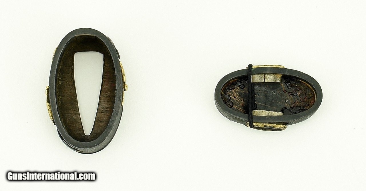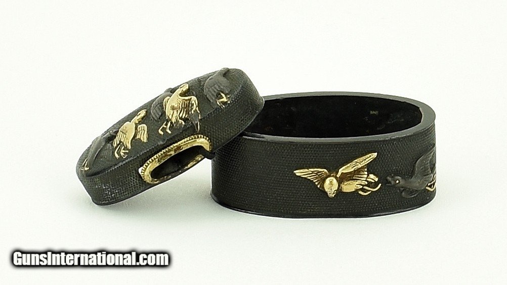 Description: "Kinko Fuchi Kashira. Motif of birds in flight. Shakudo nanako ground. Signed: Yanagawa Nao Mitsu (Kao). 1733-1809. Went to Yedo and became a pupil of Yanagawa Naomasa. Became 4th hereditary Yanagawa master. Ref: Baur, P.391 (408). Beautiful work! SOLD |