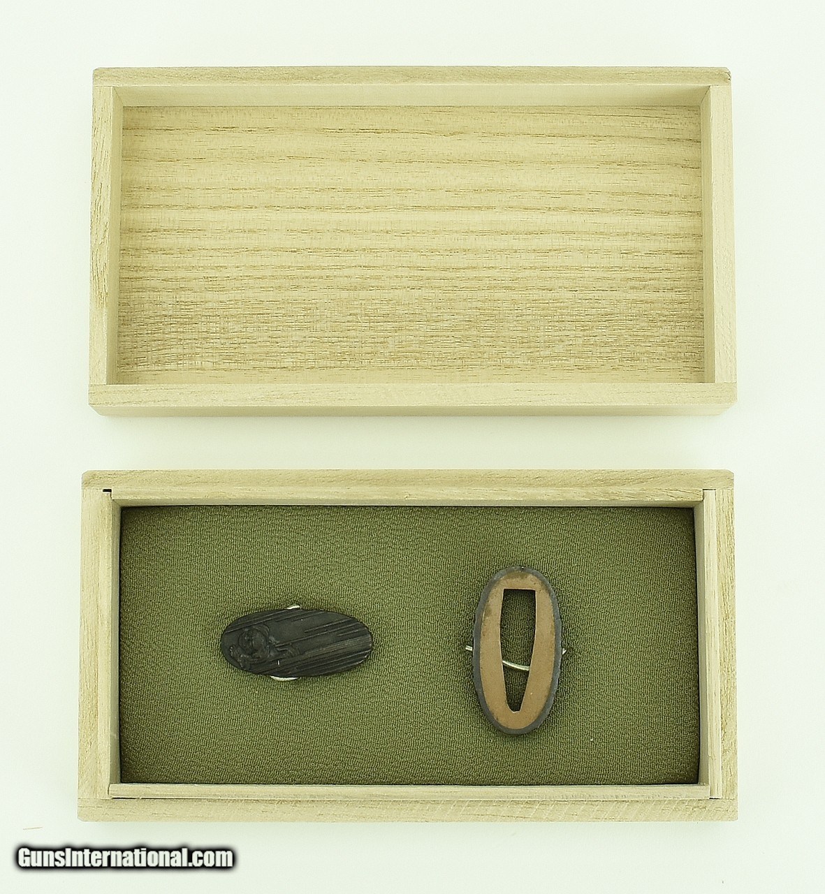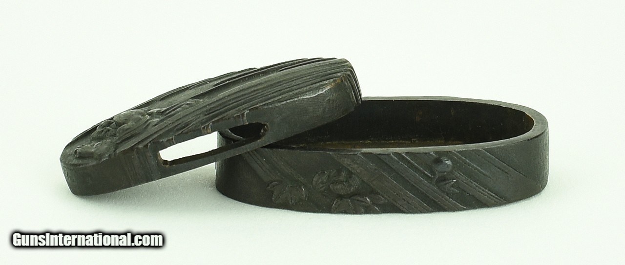 Description: "Kinko Fuchi Kashira. Ishimei or stone ground shi-shi and foliage motif. Unsigned. Tanto size. SOLD |