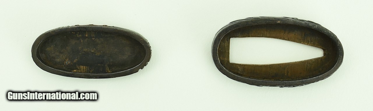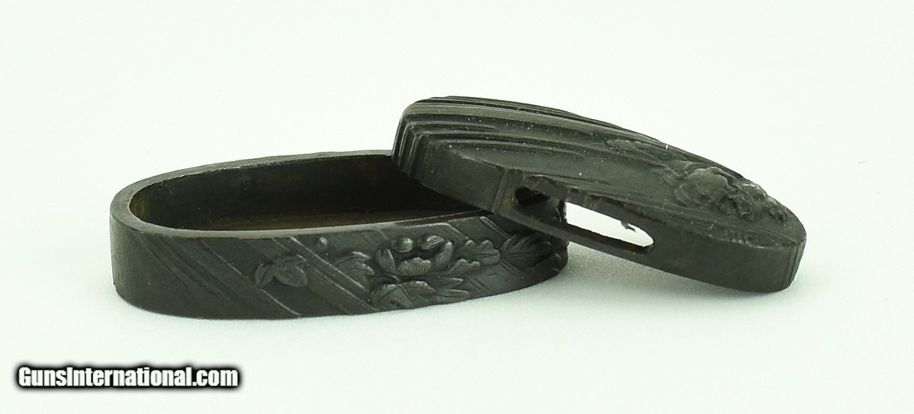 Description: "Kinko Fuchi Kashira. Ishimei or stone ground shi-shi and foliage motif. Unsigned. Tanto size. SOLD |