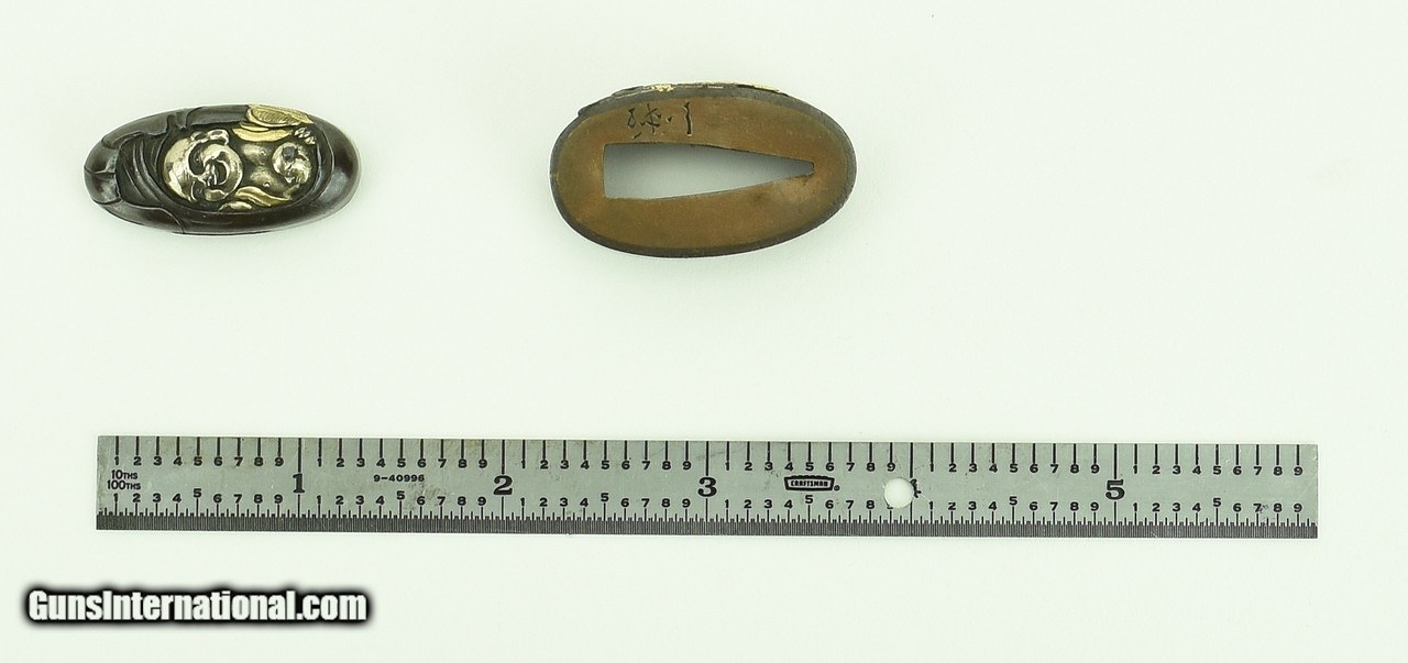 Description: "Kinko Fuchi Kashira. Polished shibuichi ground. Figures with gold, silver and shakudo highlights. SOLD |