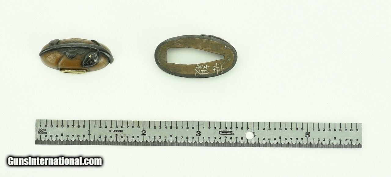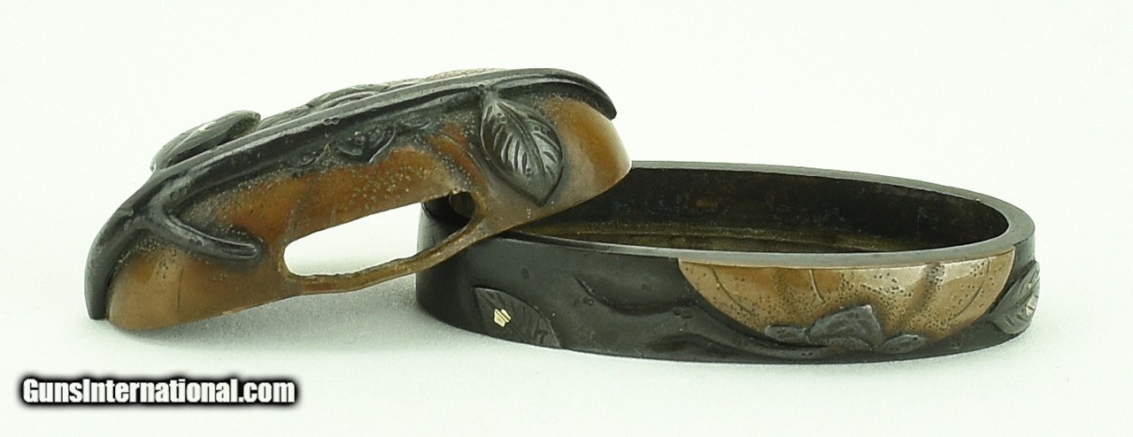 Description: "Kinko Fuchi Kashira. Polished copper ground. Shakudo branches with leaves. Gold highlights. Signed: Yasu Chika SOLD |